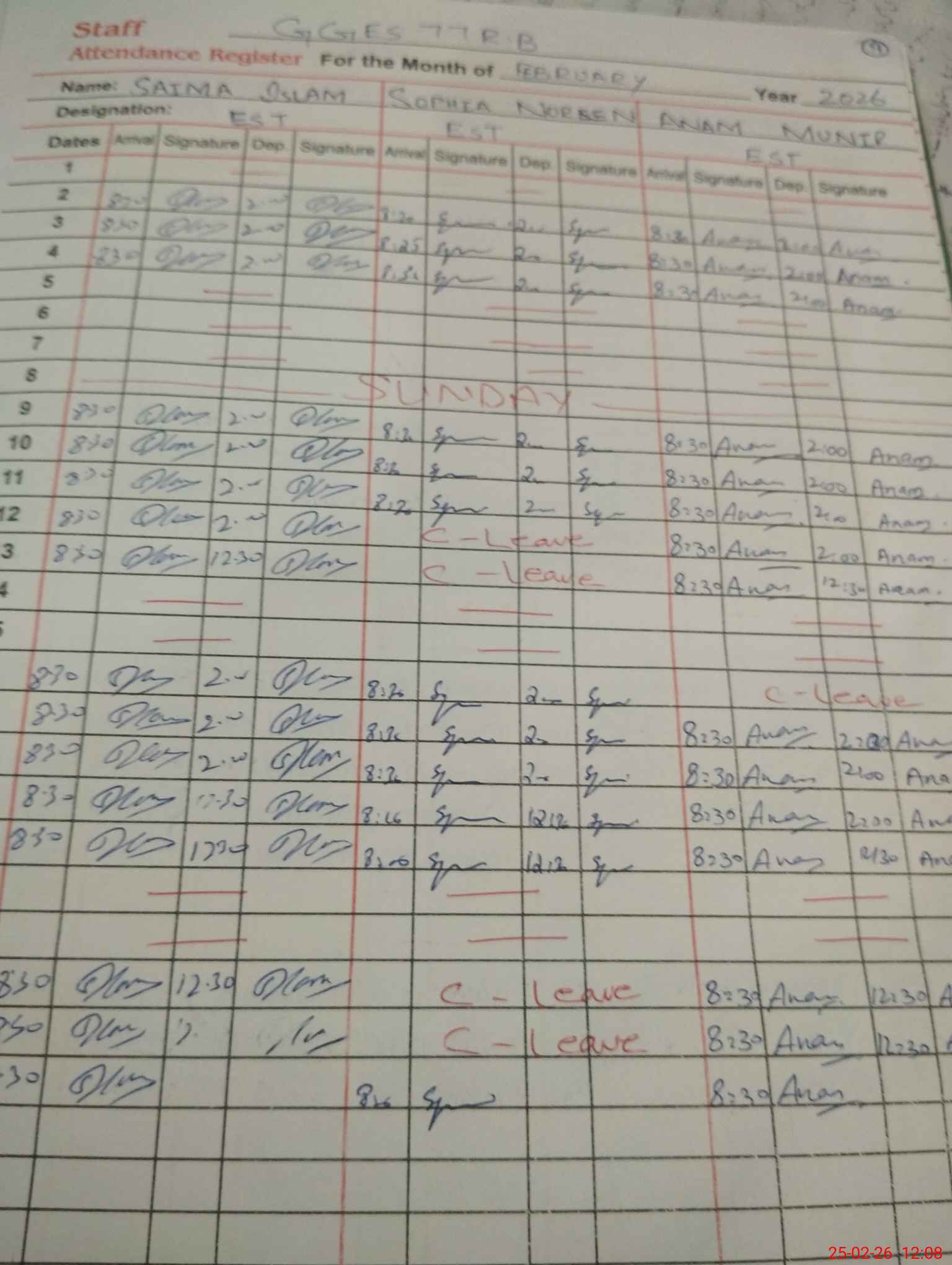 | CNIC | Full Name | Designation | R/C | Absence During Last Calender Month |