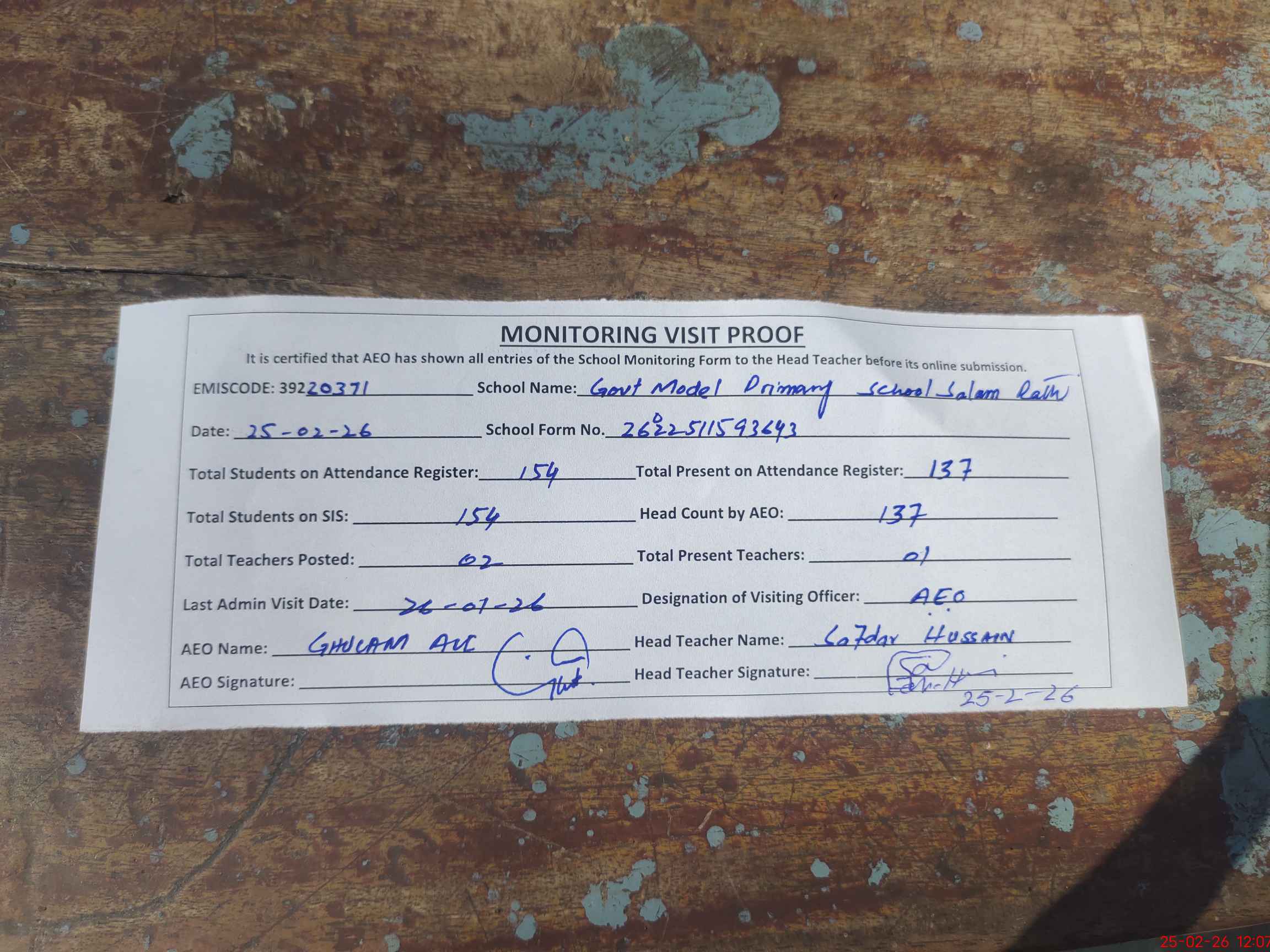 | Attendance Register | Head Teacher | MEA with School | Visit Proof |