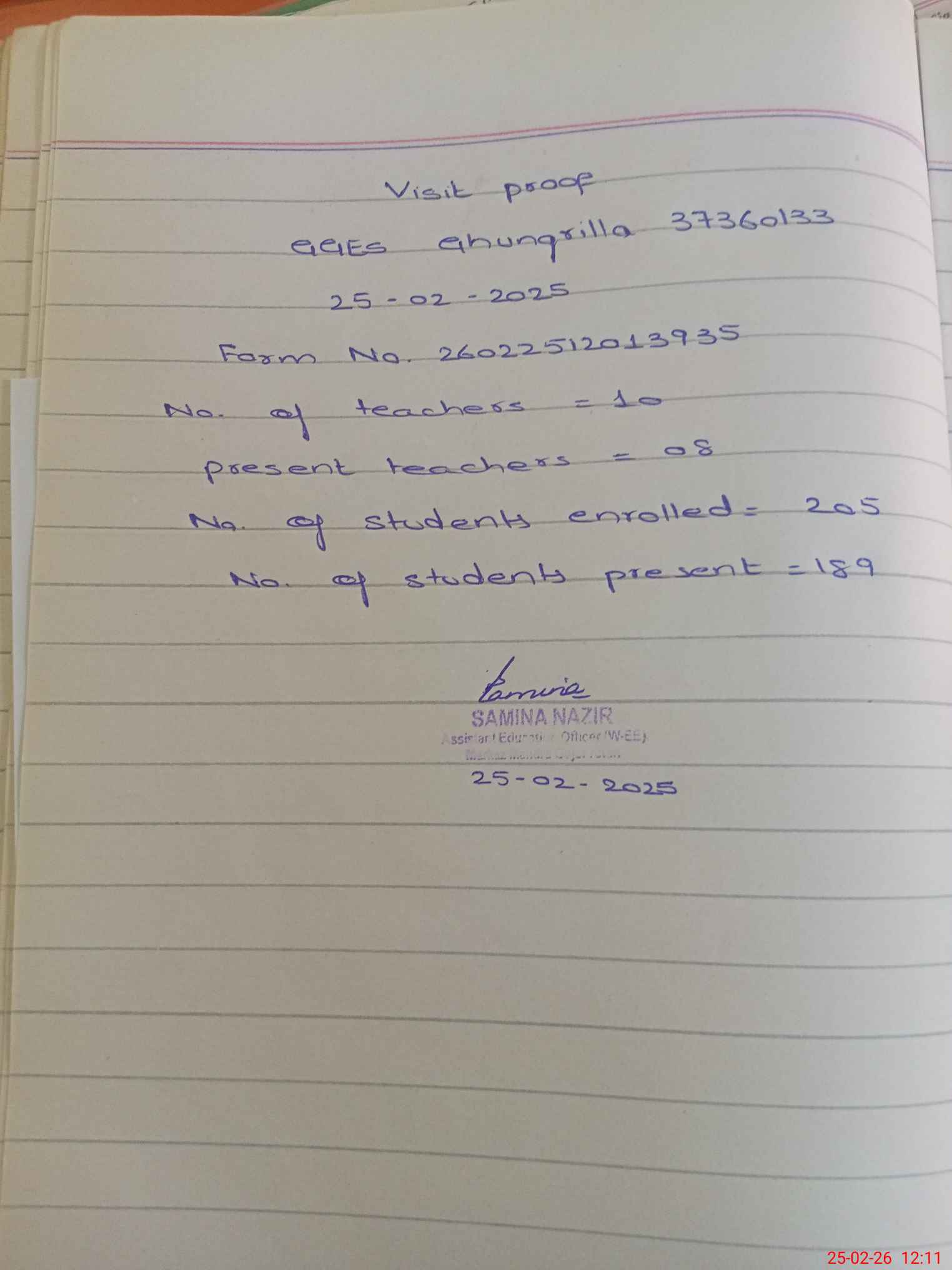 | Attendance Register | Head Teacher | MEA with School | Visit Proof |