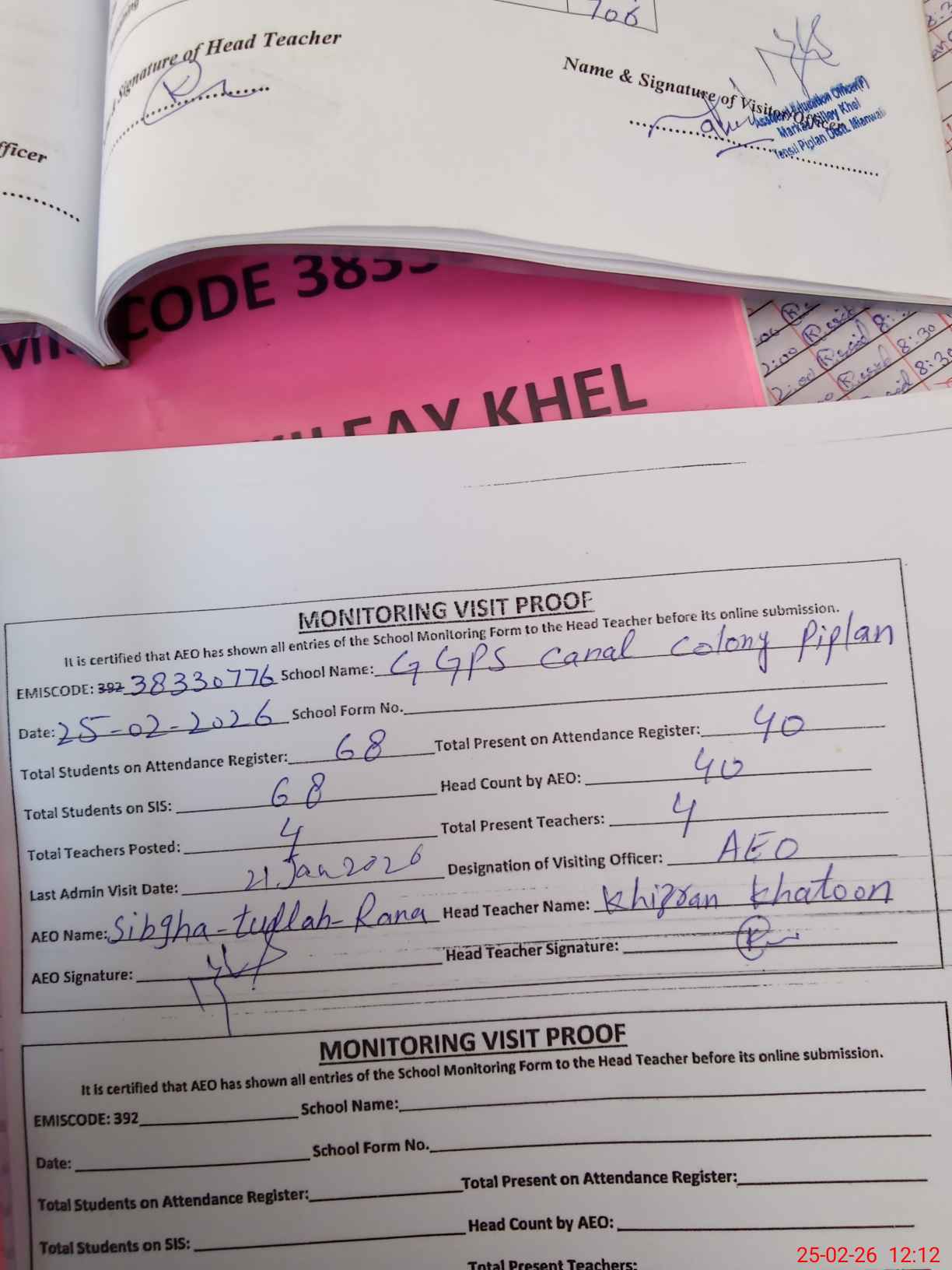 | Attendance Register | Head Teacher | MEA with School | Visit Proof |