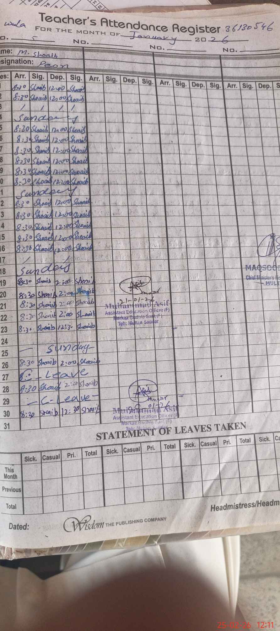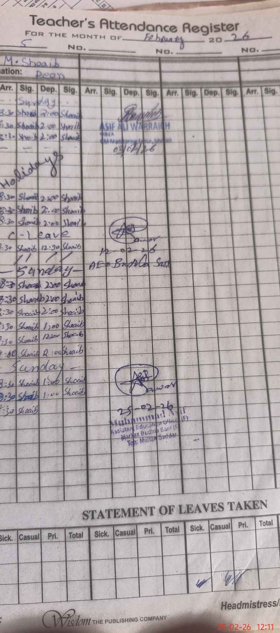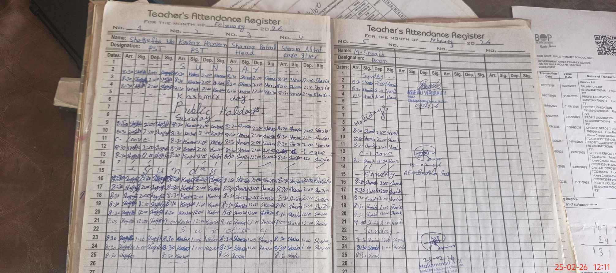 | Name: SH**** BA**** Designation: (School Headmaster's/Headmistress's) PST/ Phone/Cell Number: 03**** |