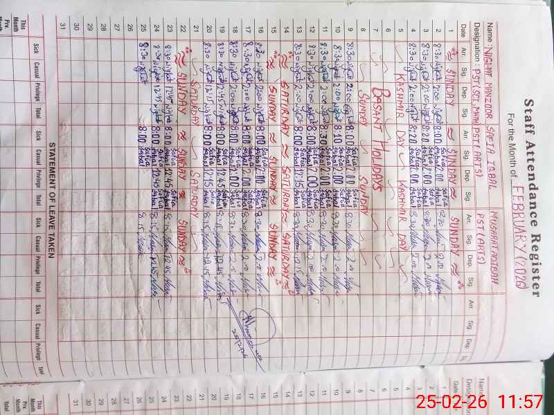 | CNIC | Full Name | Designation | R/C | Absence During Last Calender Month |