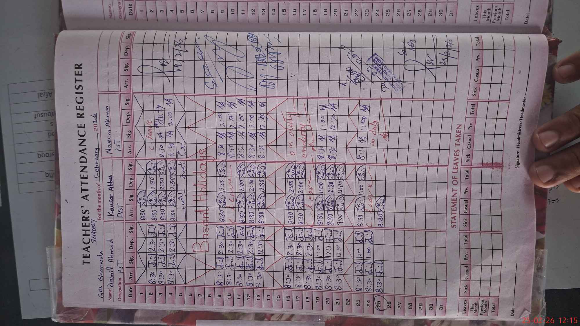 | Leave | Duty | Absent | Maternity | Medical | Ex- Pak |