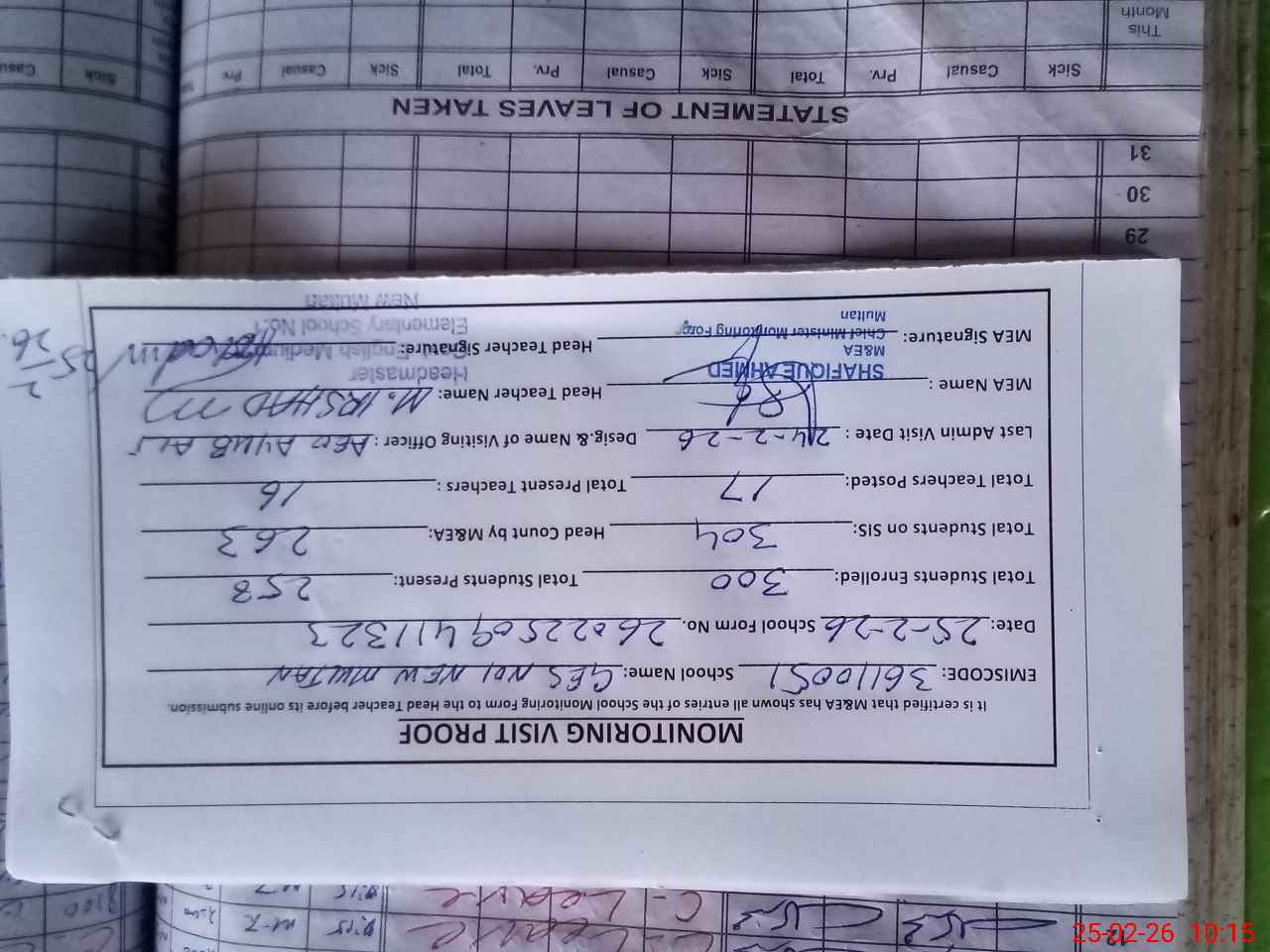 | Monitoring Date: 25-02-2026 | Start Time: 25-02-2026 09:41 AM | End Time: 25-02-2026 10:15 AM | Name of MEA: SH**** AH**** | |