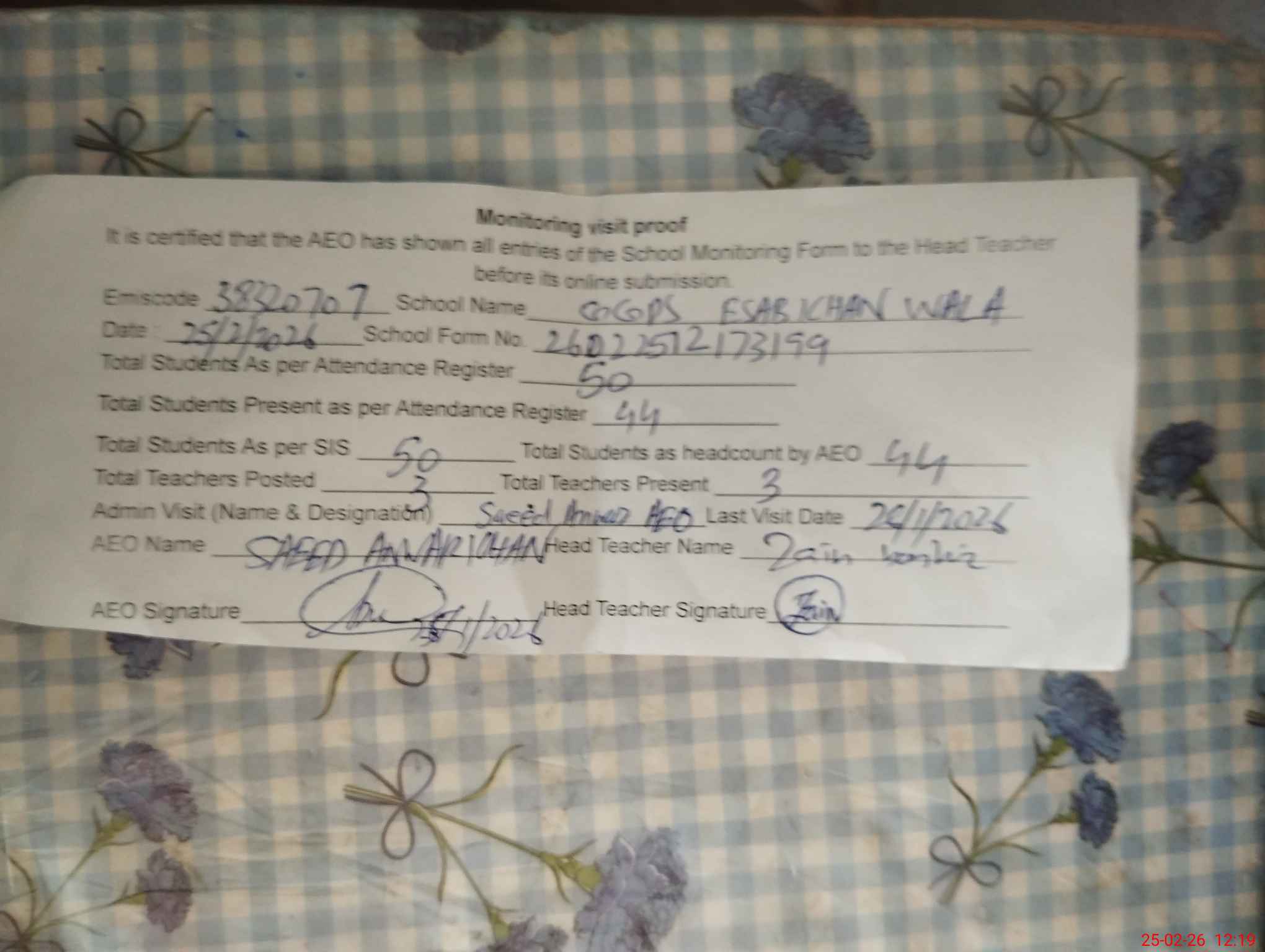 | EMIS Code: 38320707 | Name of School: GGPS ESAB KHAN WALA | |||