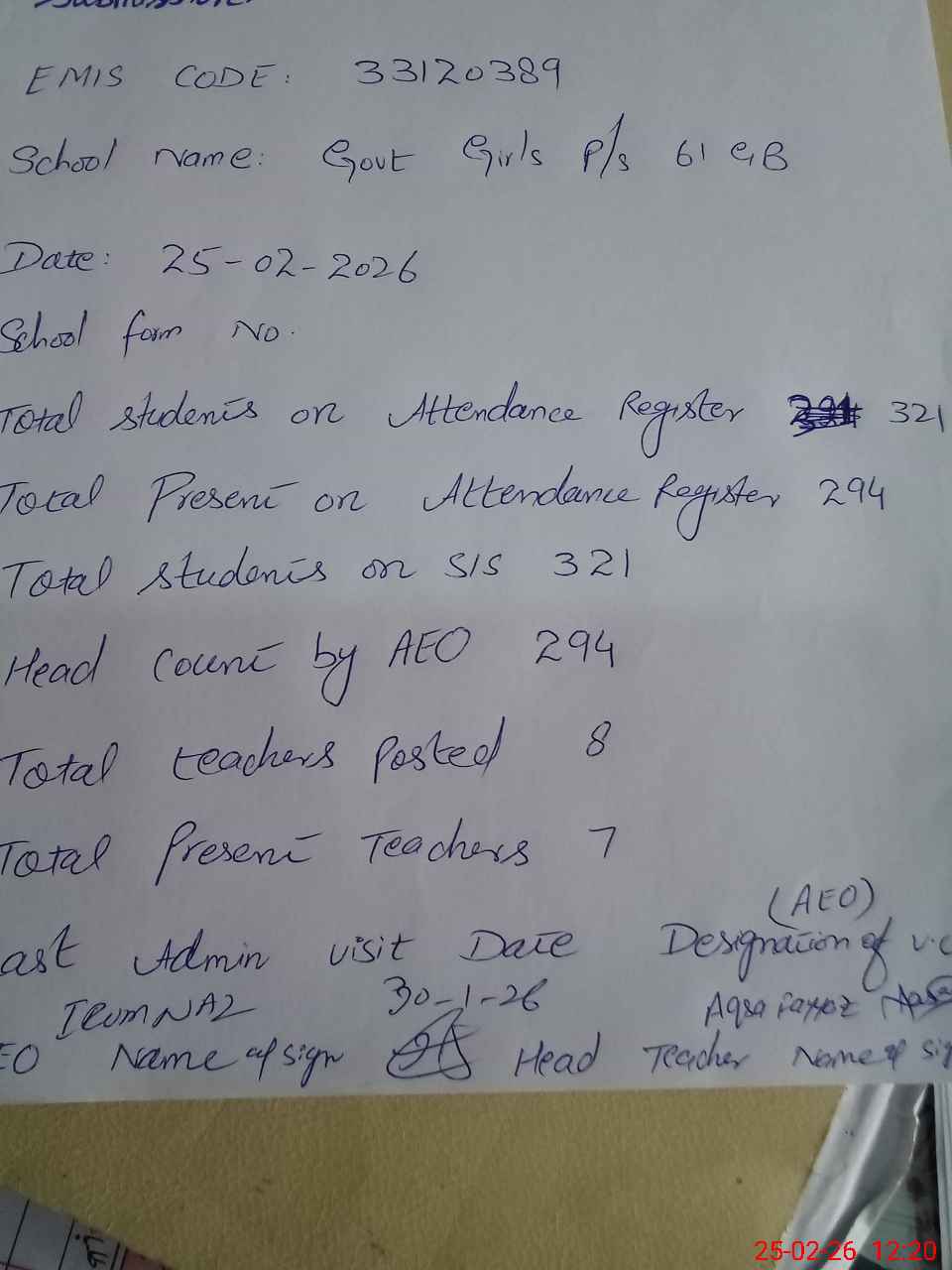 | Attendance Register | Head Teacher | MEA with School | Visit Proof |