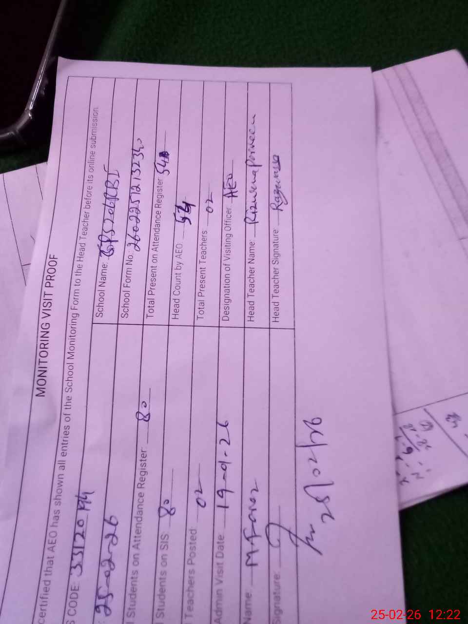 | Attendance Register | Head Teacher | MEA with School | Visit Proof |