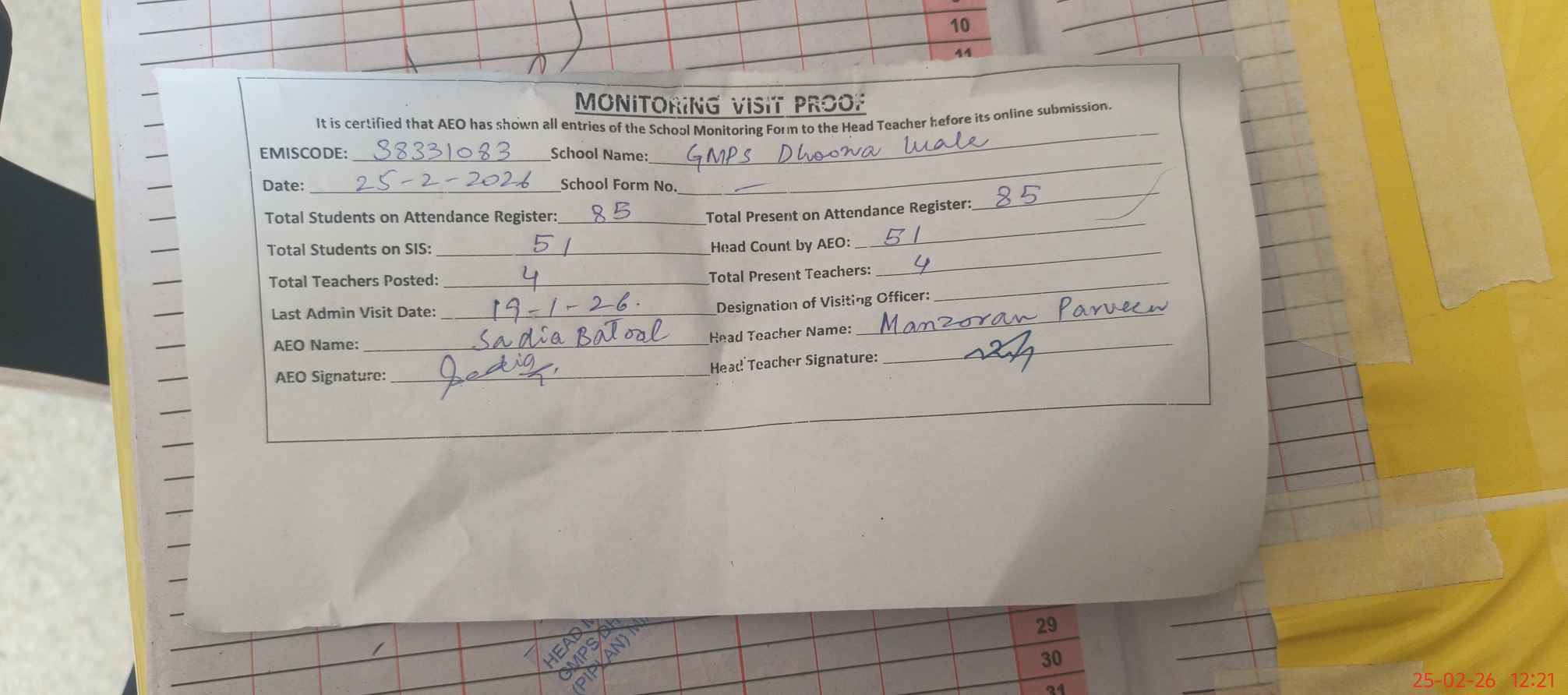 | EMIS Code: 38331083 | Name of School: GMPS DHOONA WALA | |||