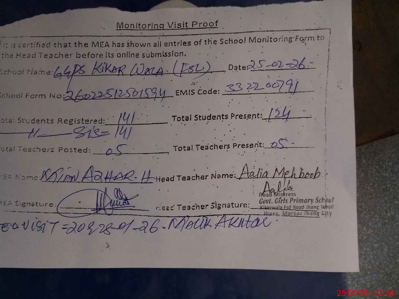 | EMIS Code: 33220791 | Name of School: GGPS KIKAR WALA | |||
