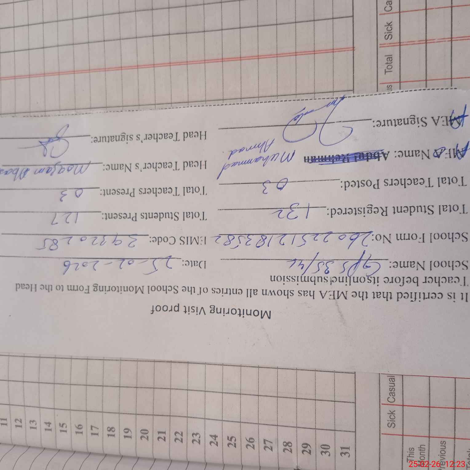 | Attendance Register | Head Teacher | MEA with School | Visit Proof |