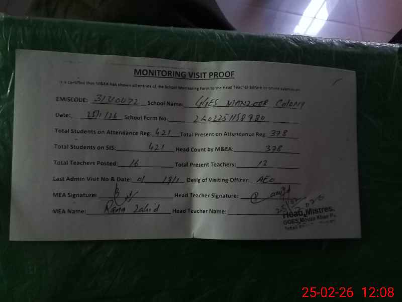 | EMIS Code: 31310072 | Name of School: GGES MOUZA KHAN PUR MANZOOR COLONY | |||