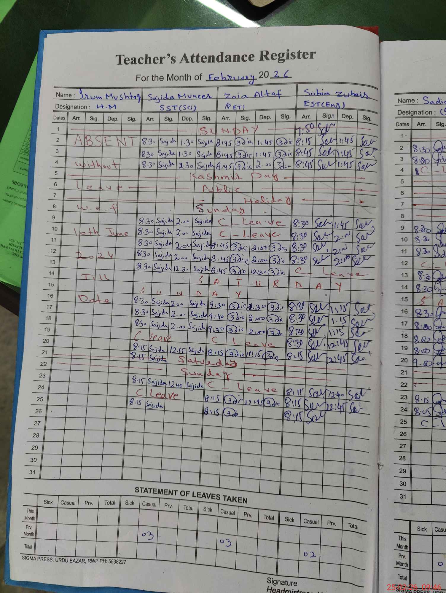 | 37**** | Ir**** Mu**** | HEADMASTER | Regular | 0 | 0 | 0 | 0 | 0 | 0 | 0 | 0 | 0 | Absent (Un-Authorized) |