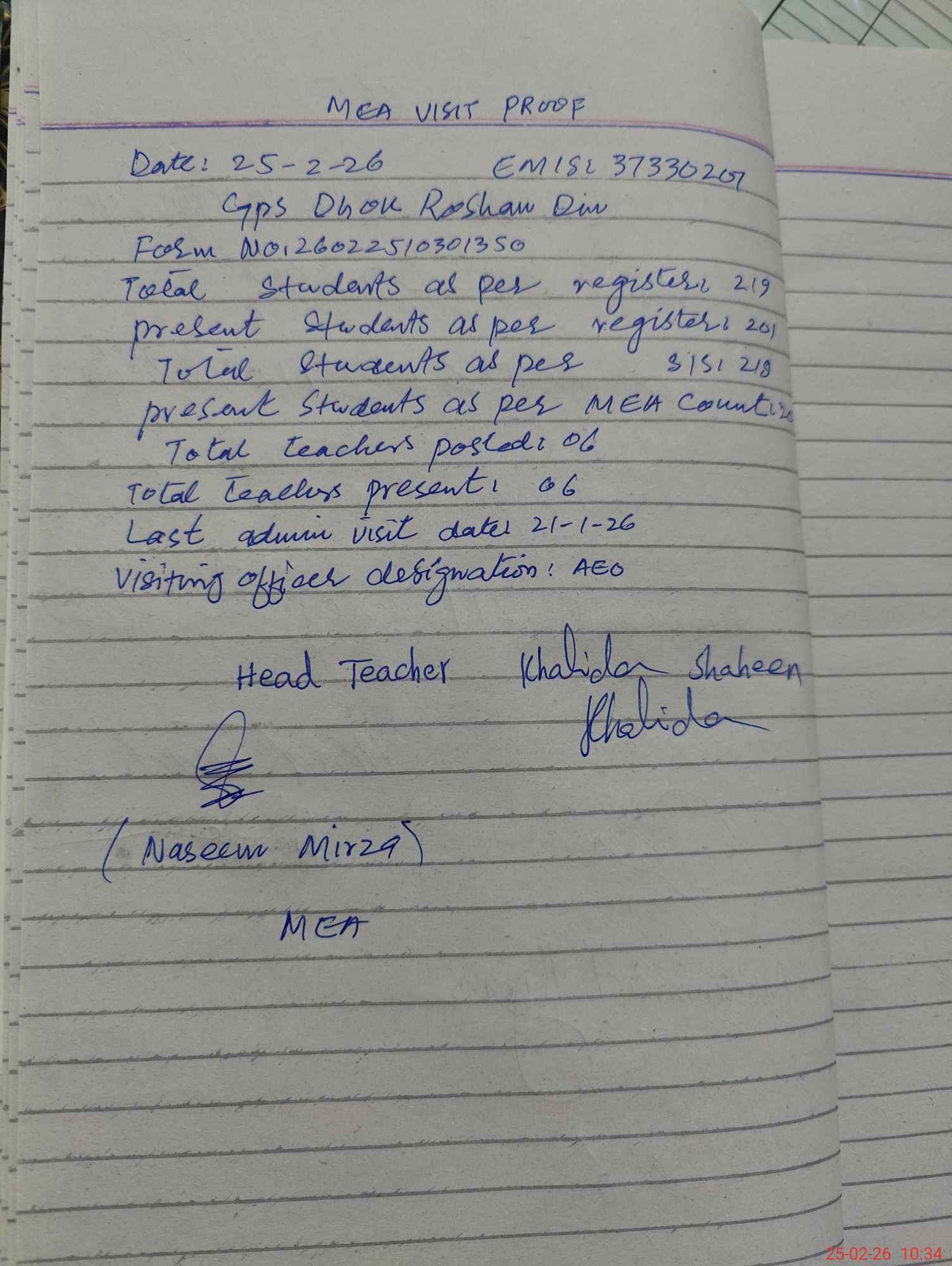 | Attendance Register | Head Teacher | MEA with School | Visit Proof |