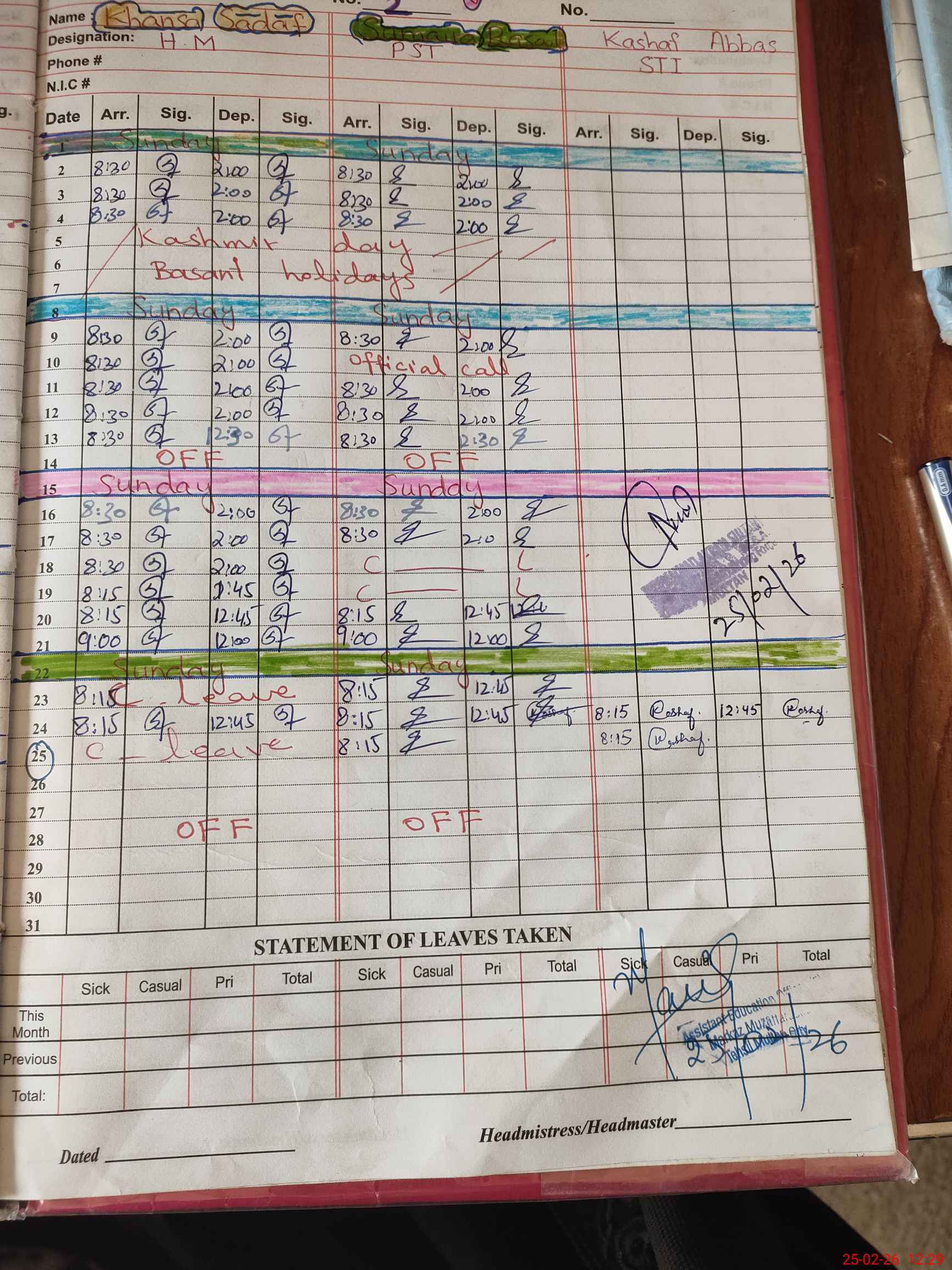 | CNIC | Full Name | Designation | R/C | Absence During Last Calender Month |