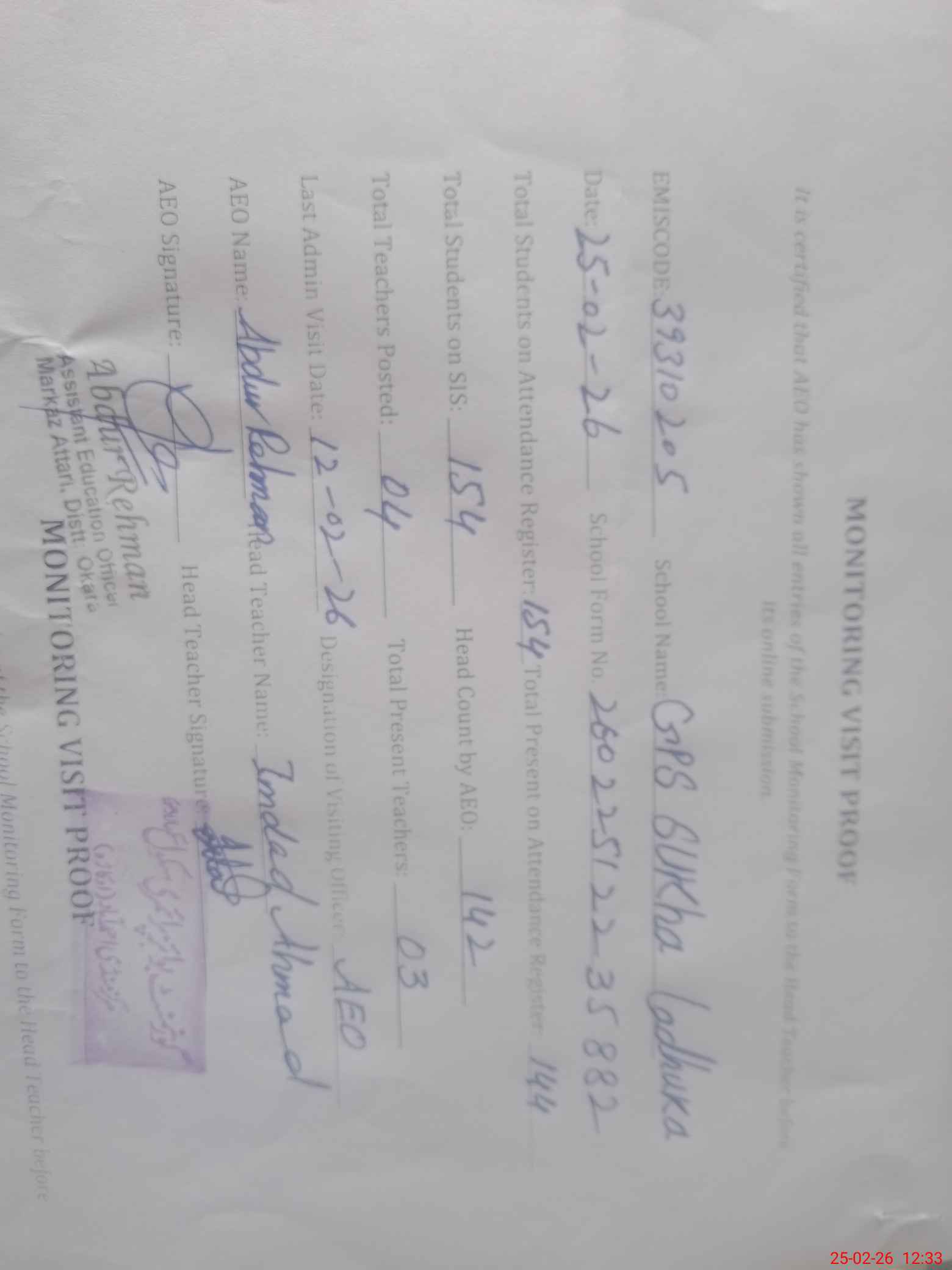 | Attendance Register | Head Teacher | MEA with School | Visit Proof |