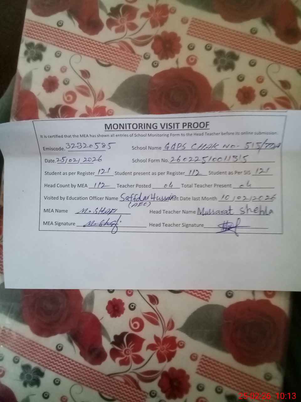 | Certified that this School was Inspected by the Undersigned MEA/DMO Today and the Information Stated Above is as Per Record. | |||||