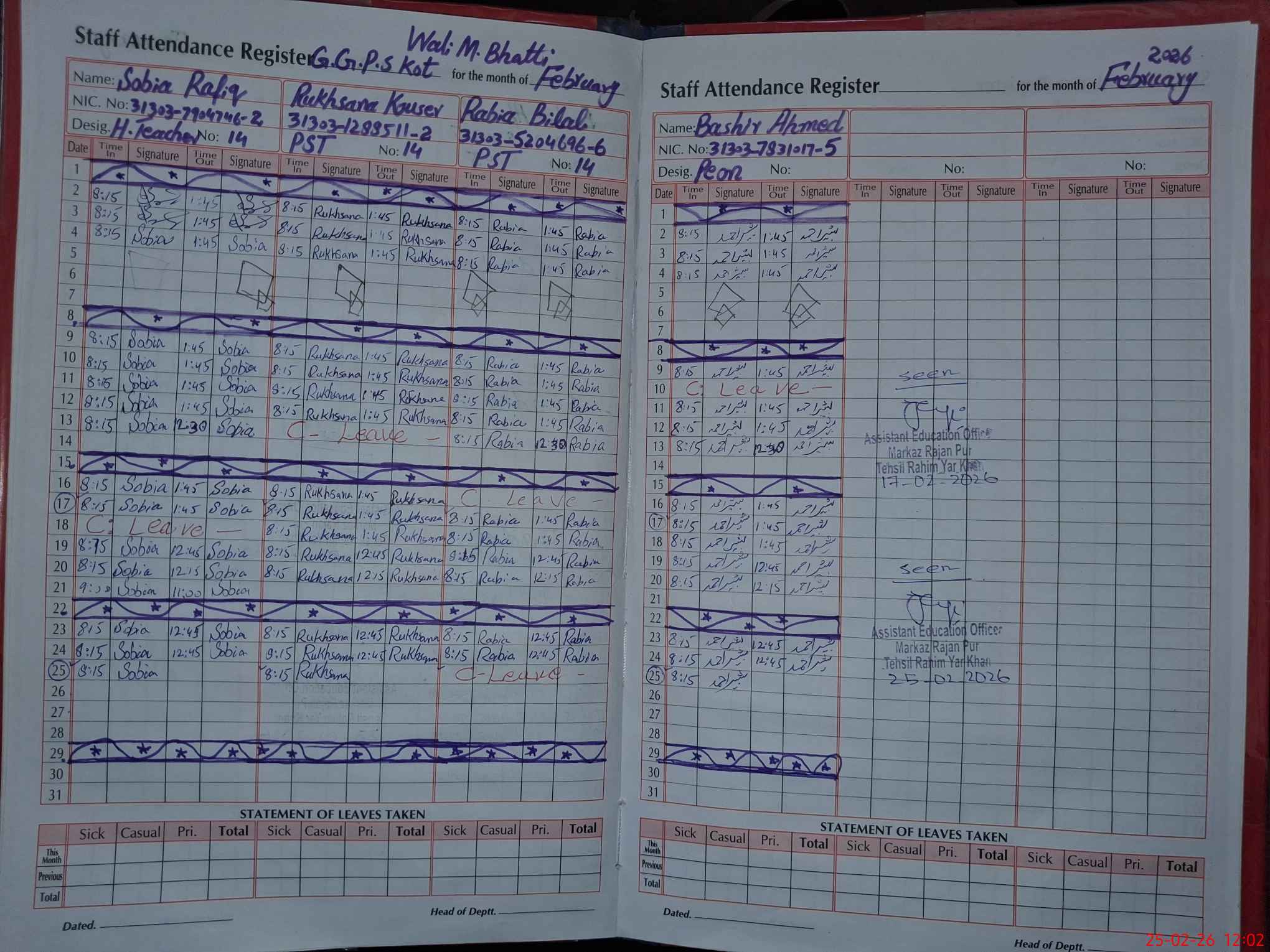 | CNIC | Full Name | Designation | R/C | Absence During Last Calender Month |