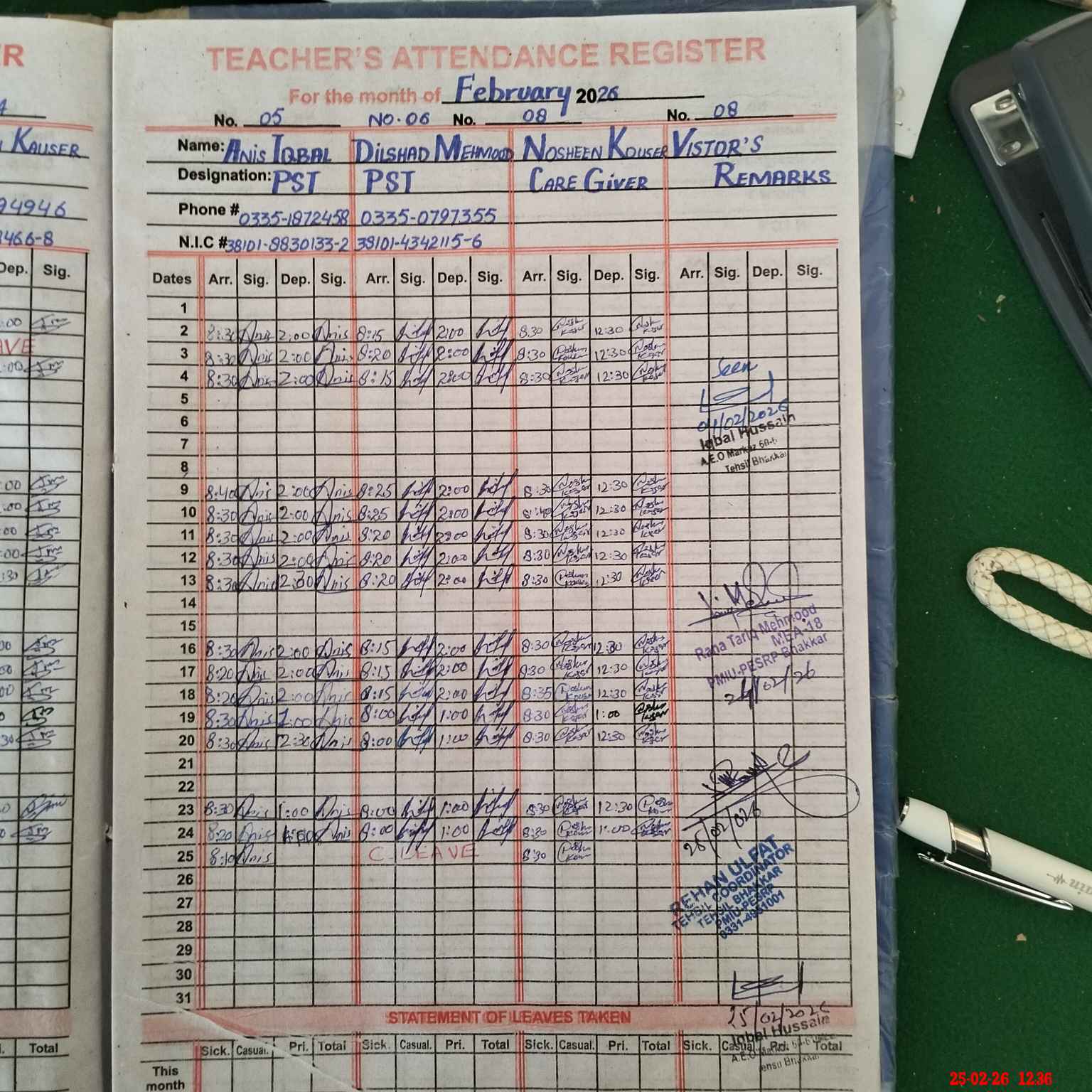 | CNIC | Full Name | Designation | R/C | Absence during last cal. month |