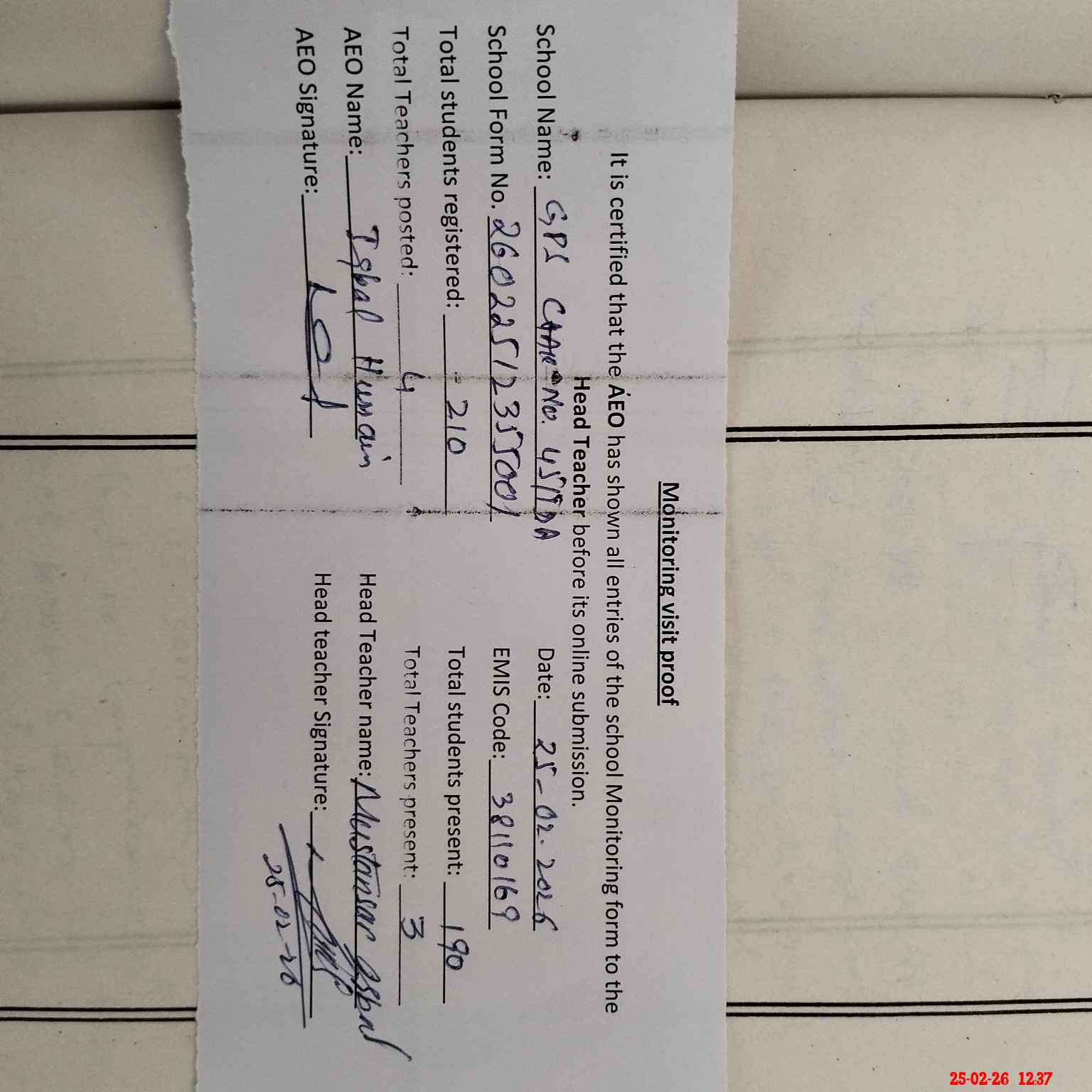 | Attendance Register | Head Teacher | MEA with School | Visit Proof |