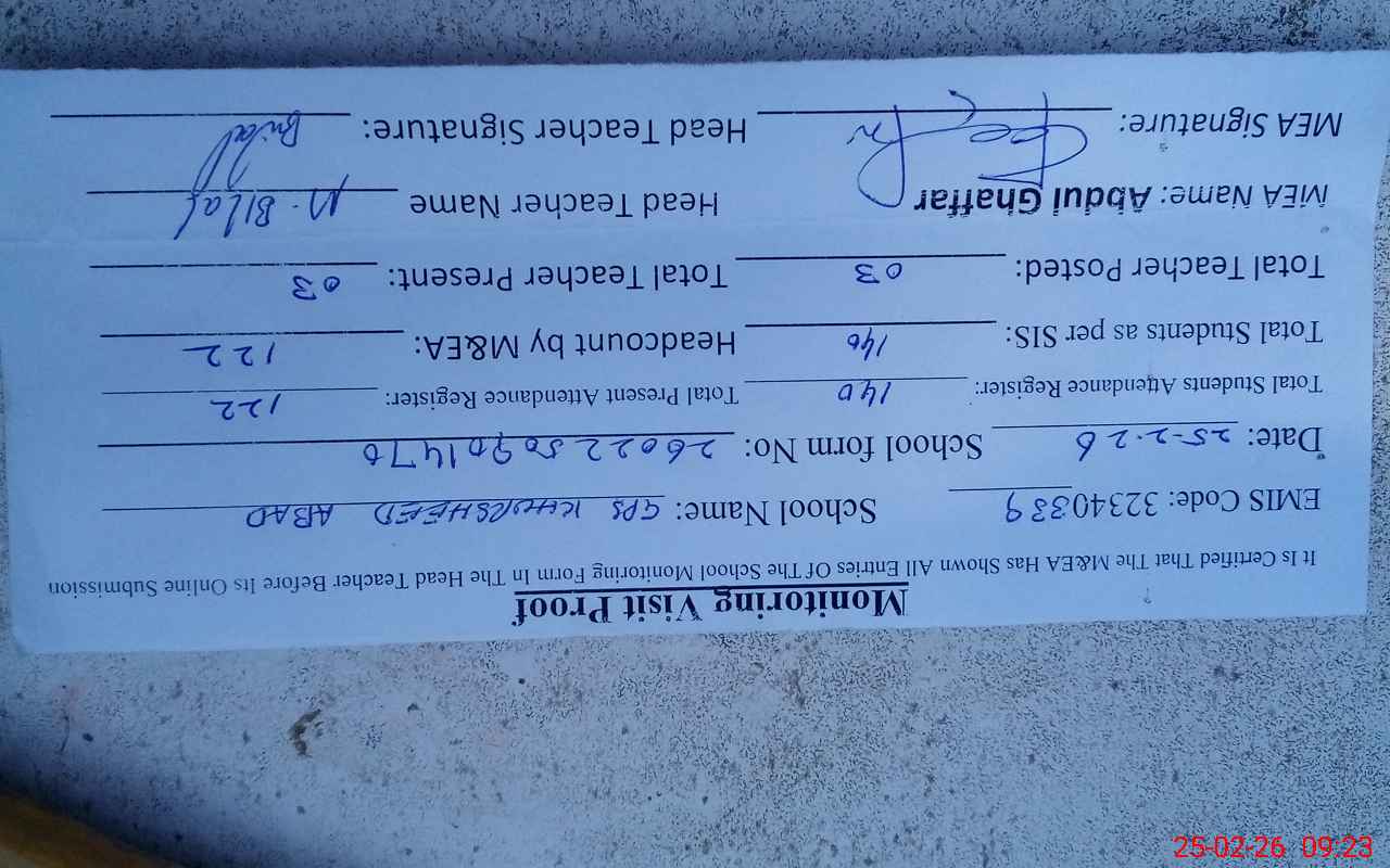 | Attendance Register | Head Teacher | MEA with School | Visit Proof |