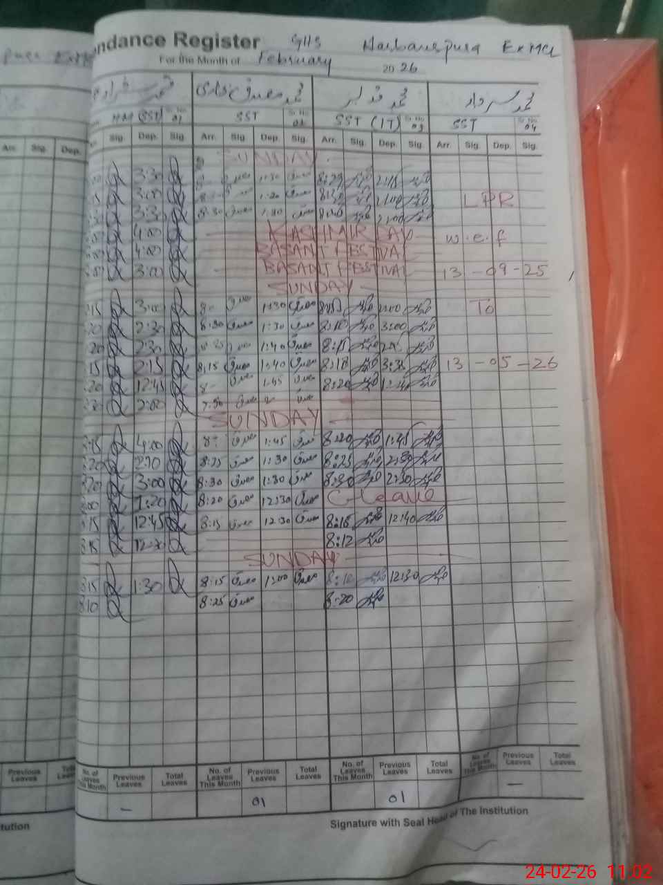 | Remarks (Use Separate Page if Required): 1 There are 06 classrooms are in a portion which is away from main campus 2 The class 5 is in the afternoon shift so does the attendance not taken 3 There are 02 classrooms are under construction since 27 December 2025 | |||||