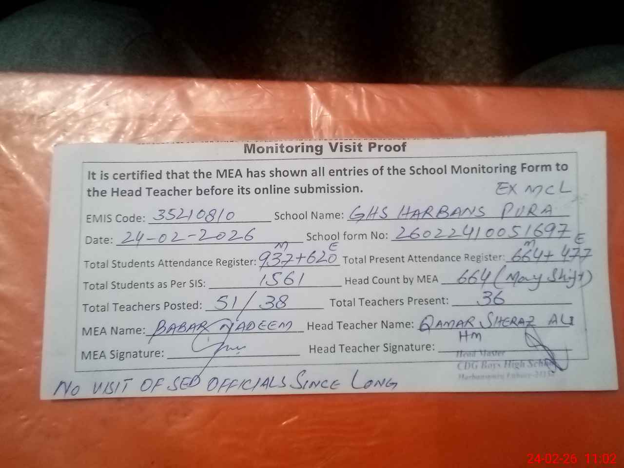 | Attendance Register | Head Teacher | MEA with School | Visit Proof |