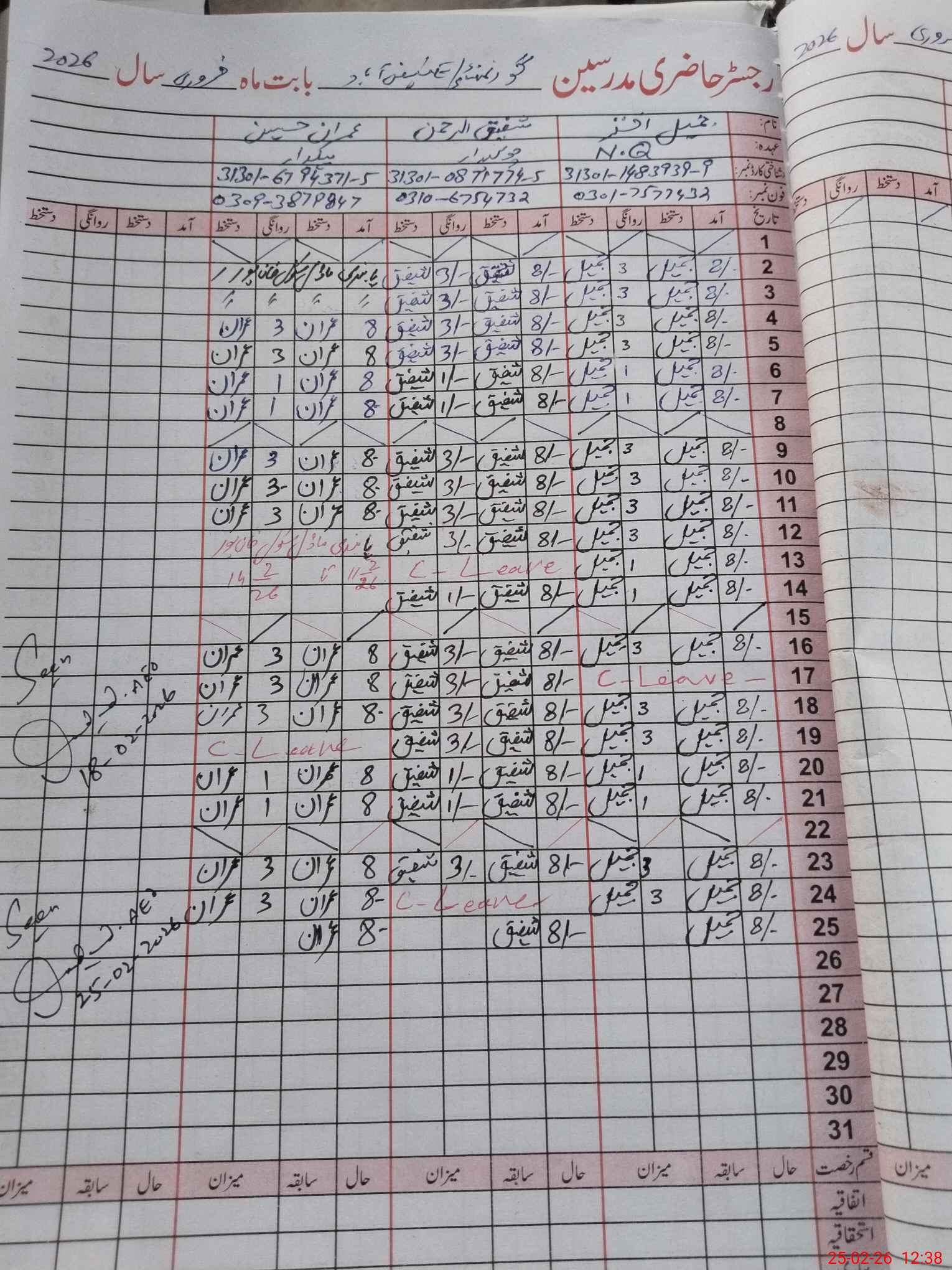 | CNIC | Full Name | Designation | R/C | Absence during last cal. month |