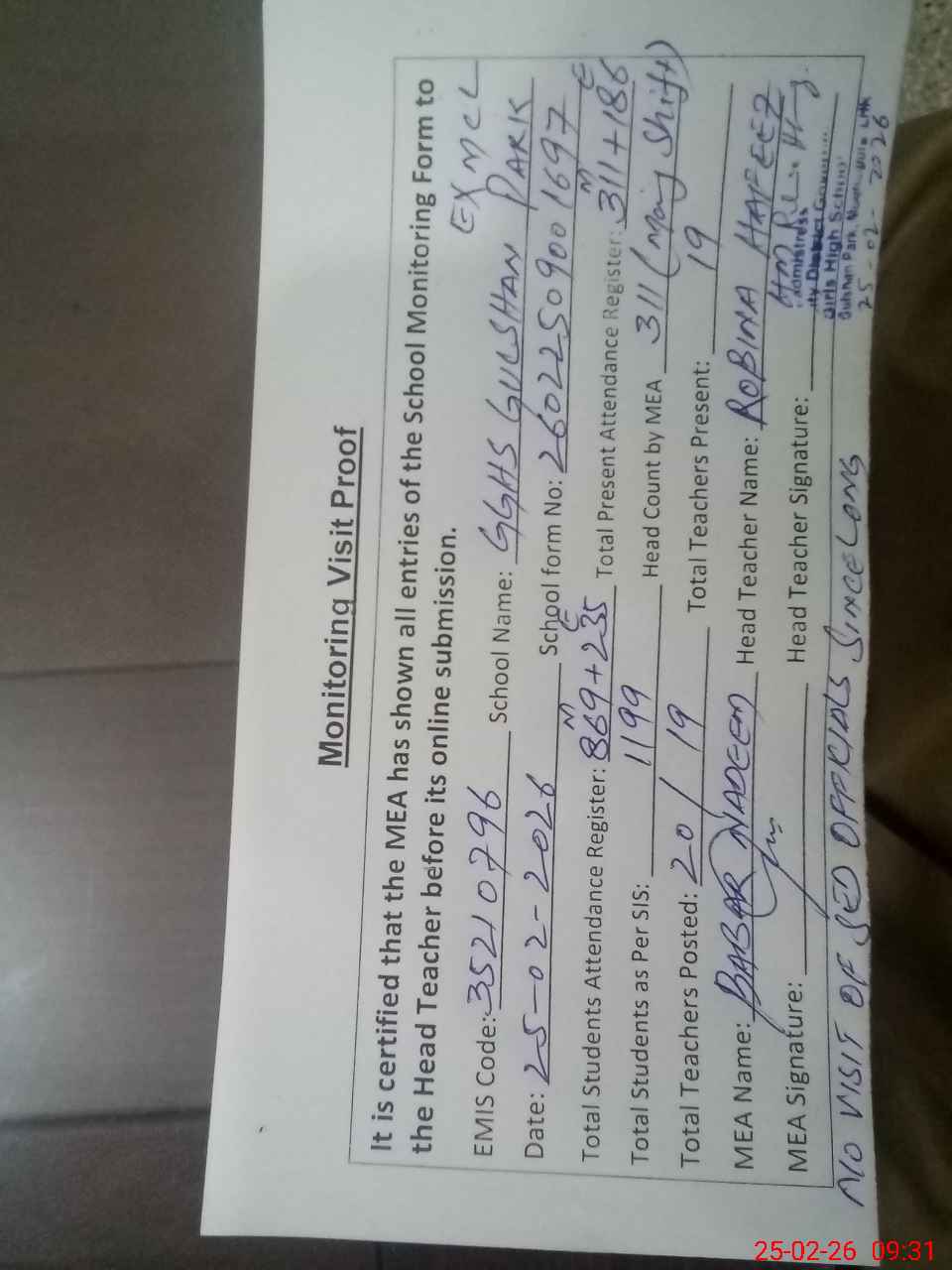 | Attendance Register | Head Teacher | MEA with School | Visit Proof |