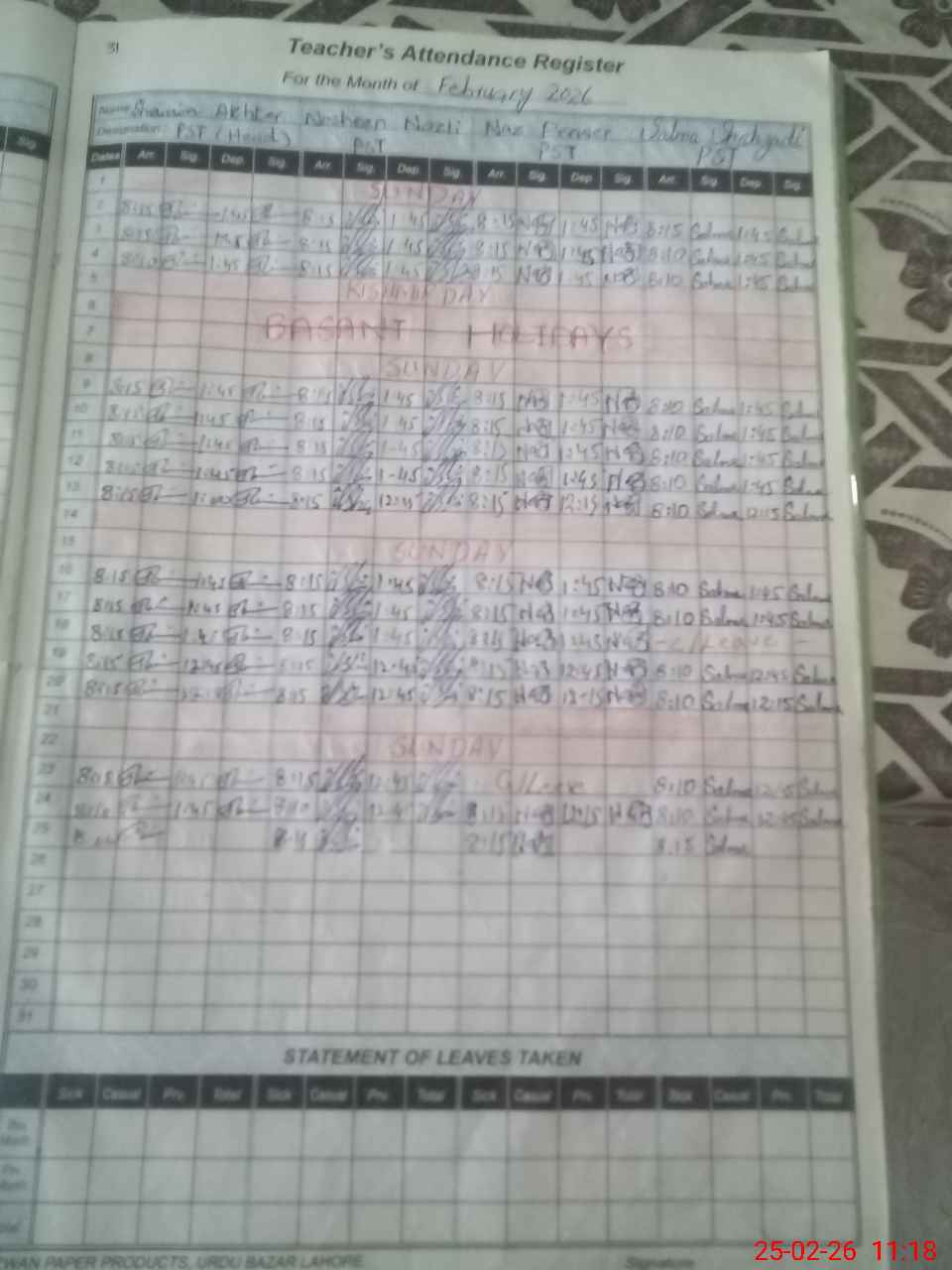 | Leave | Duty | Absent | Maternity | Medical | Ex- Pak |