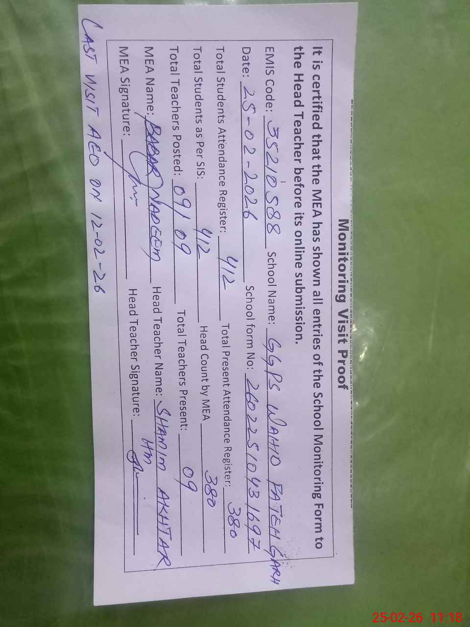 | Attendance Register | Head Teacher | MEA with School | Visit Proof |