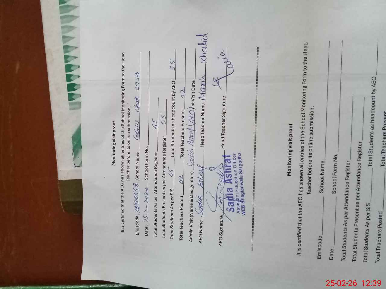 | Certified that this School was Inspected by the Undersigned MEA/DMO Today and the Information Stated Above is as Per Record. | |||||