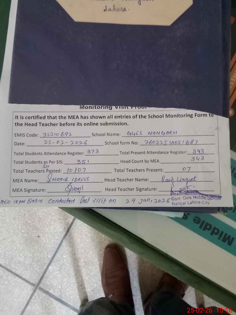 | Attendance Register | Head Teacher | MEA with School | Visit Proof |