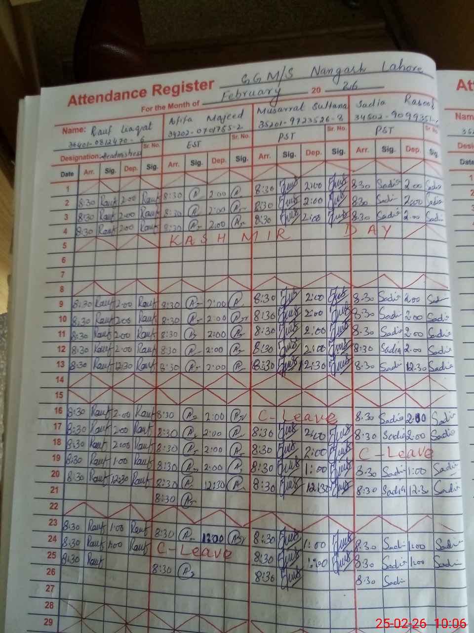 | CNIC | Full Name | Designation | R/C | Absence During Last Calender Month |