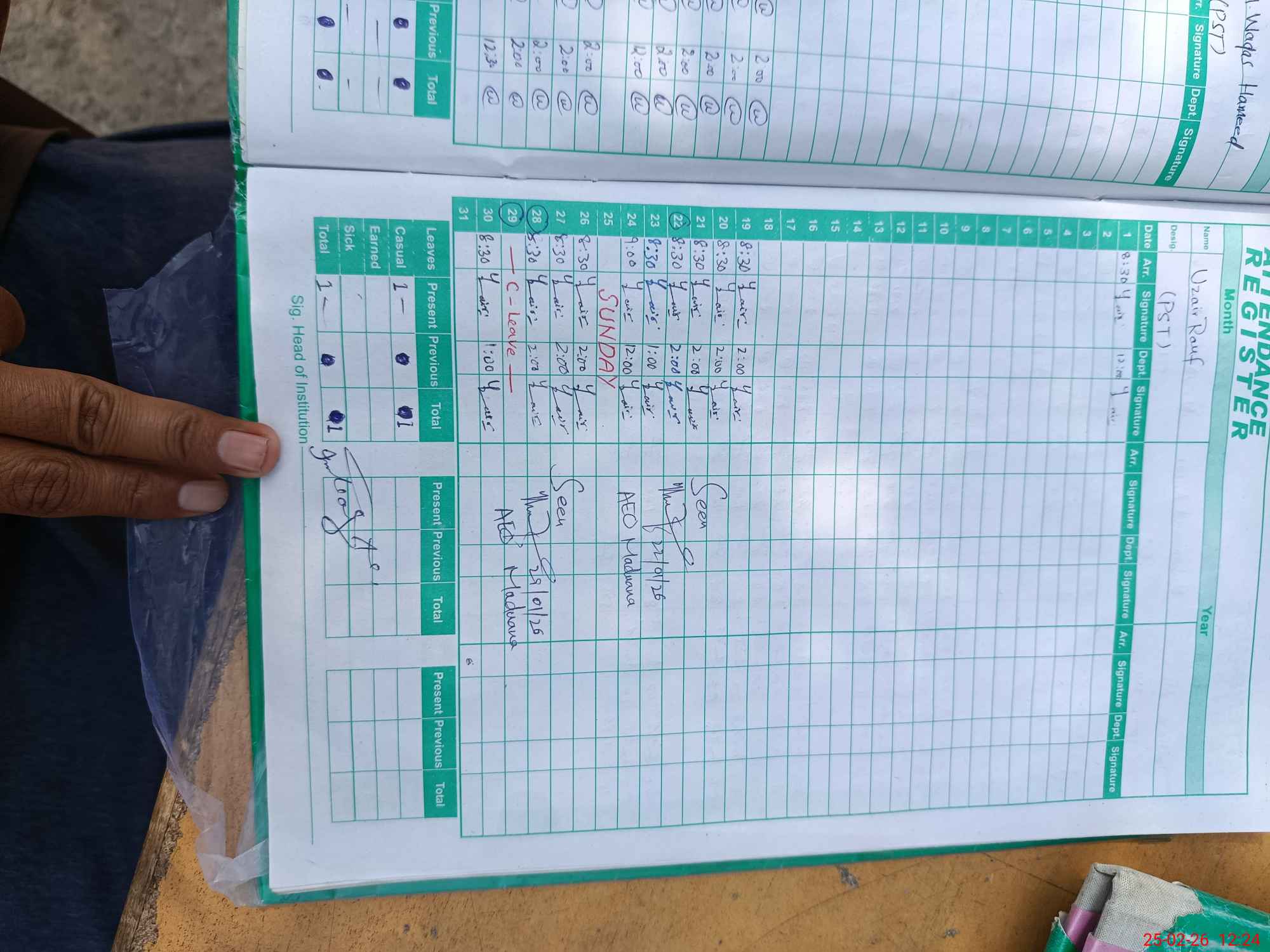 | Leave | Duty | Absent | Maternity | Medical | Ex- Pak |