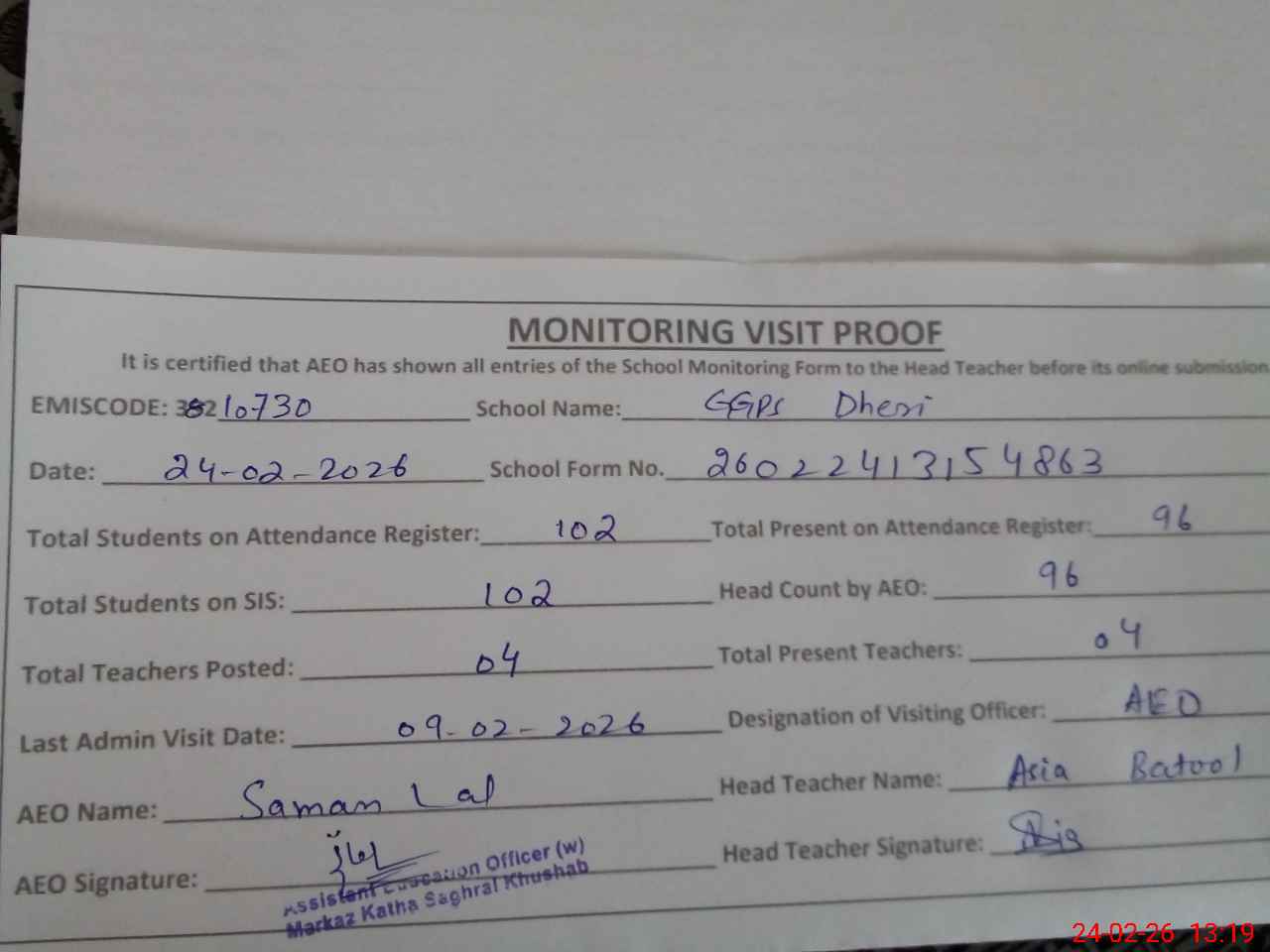 | Certified that this School was Inspected by the Undersigned MEA/DMO Today and the Information Stated Above is as Per Record. | |||||