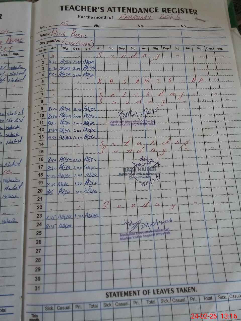 | Name: AS**** BA**** Designation: (School Headmaster's/Headmistress's) PST Phone/Cell Number: 03**** |