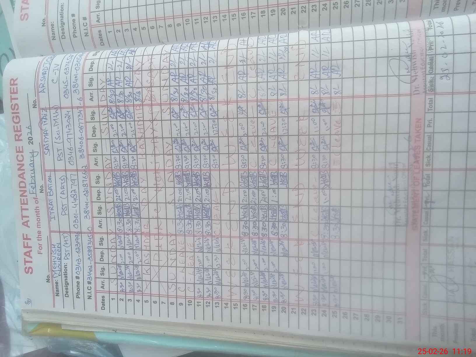| CNIC | Full Name | Designation | R/C | Absence during last cal. month |