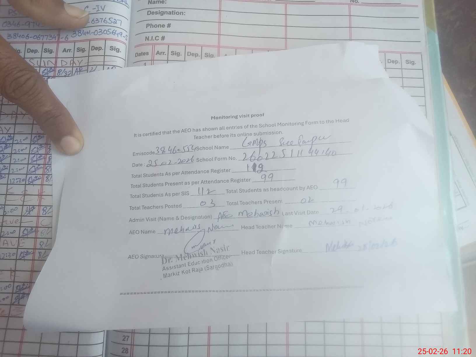 | Attendance Register | Head Teacher | MEA with School | Visit Proof |