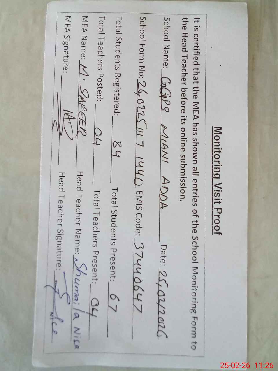 | Monitoring Date: 25-02-2026 | Start Time: 25-02-2026 10:52 AM | End Time: 25-02-2026 11:26 AM | Name of MEA: Mu**** Sa**** | |