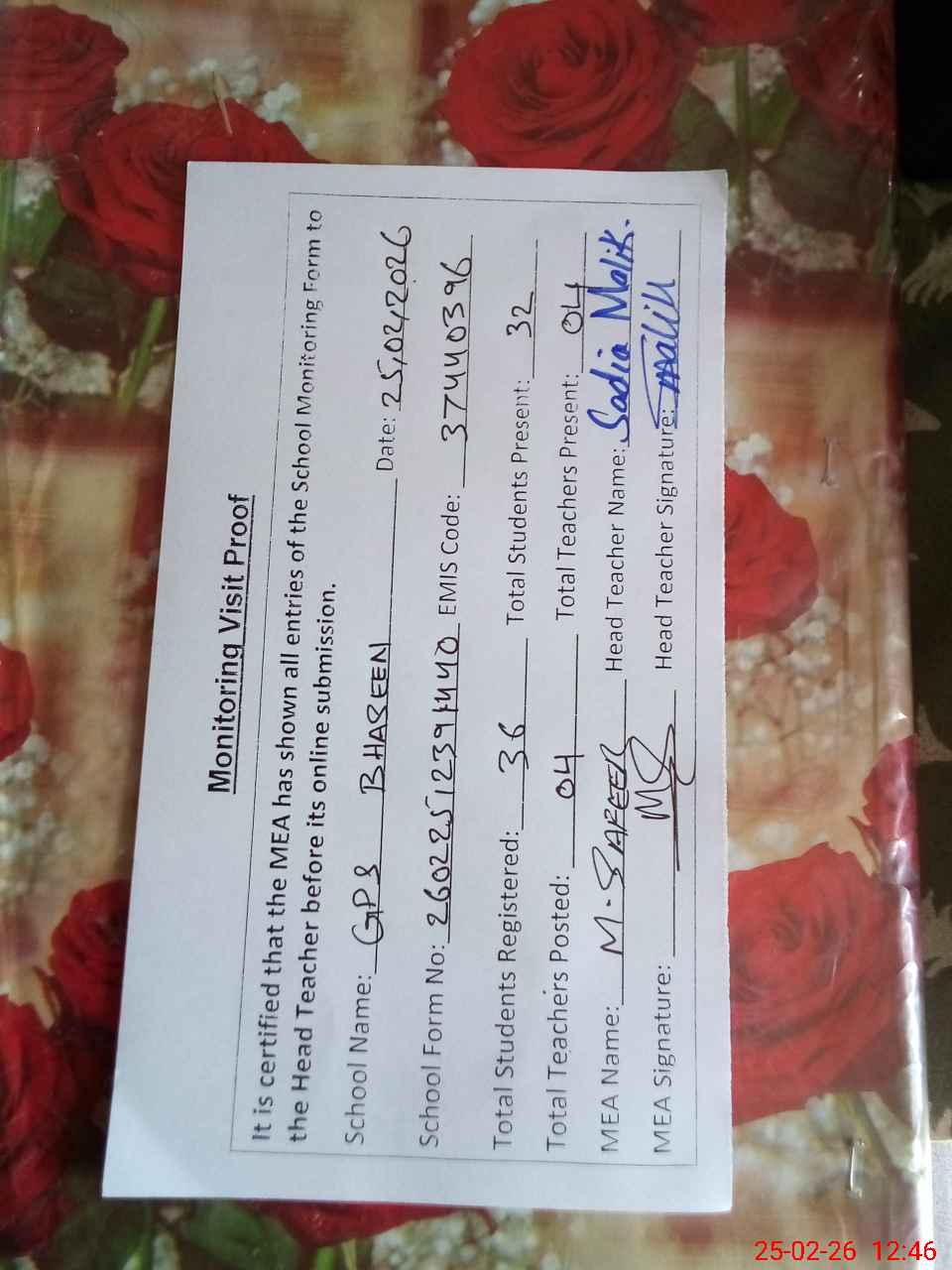 | Attendance Register | Head Teacher | MEA with School | Visit Proof |