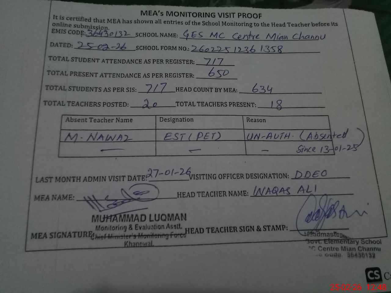 | EMIS Code: 36430132 | Name of School: GES MC CENTRE MIAN CHANNU | |||