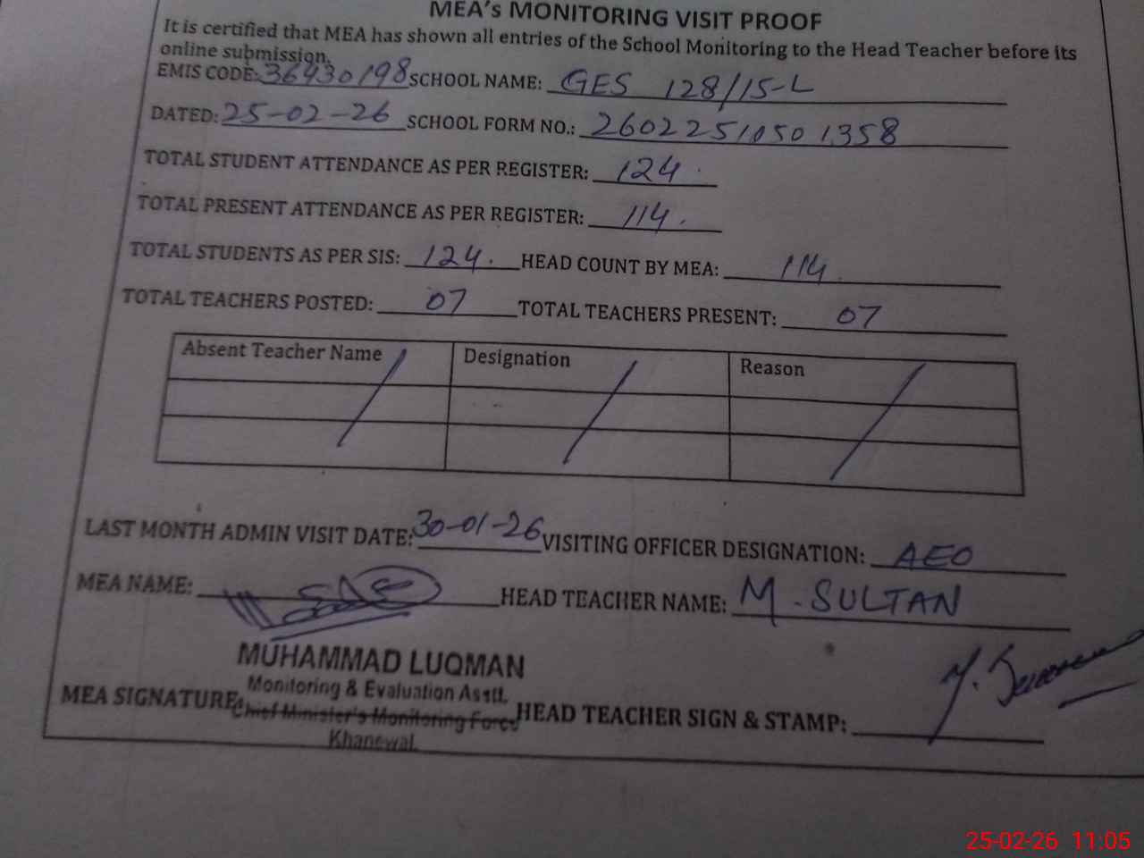 | Attendance Register | Head Teacher | MEA with School | Visit Proof |