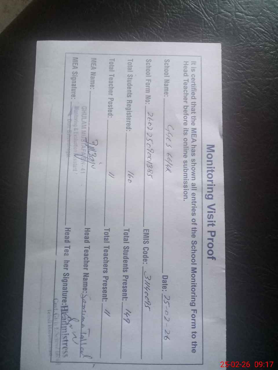 | Attendance Register | Head Teacher | MEA with School | Visit Proof |