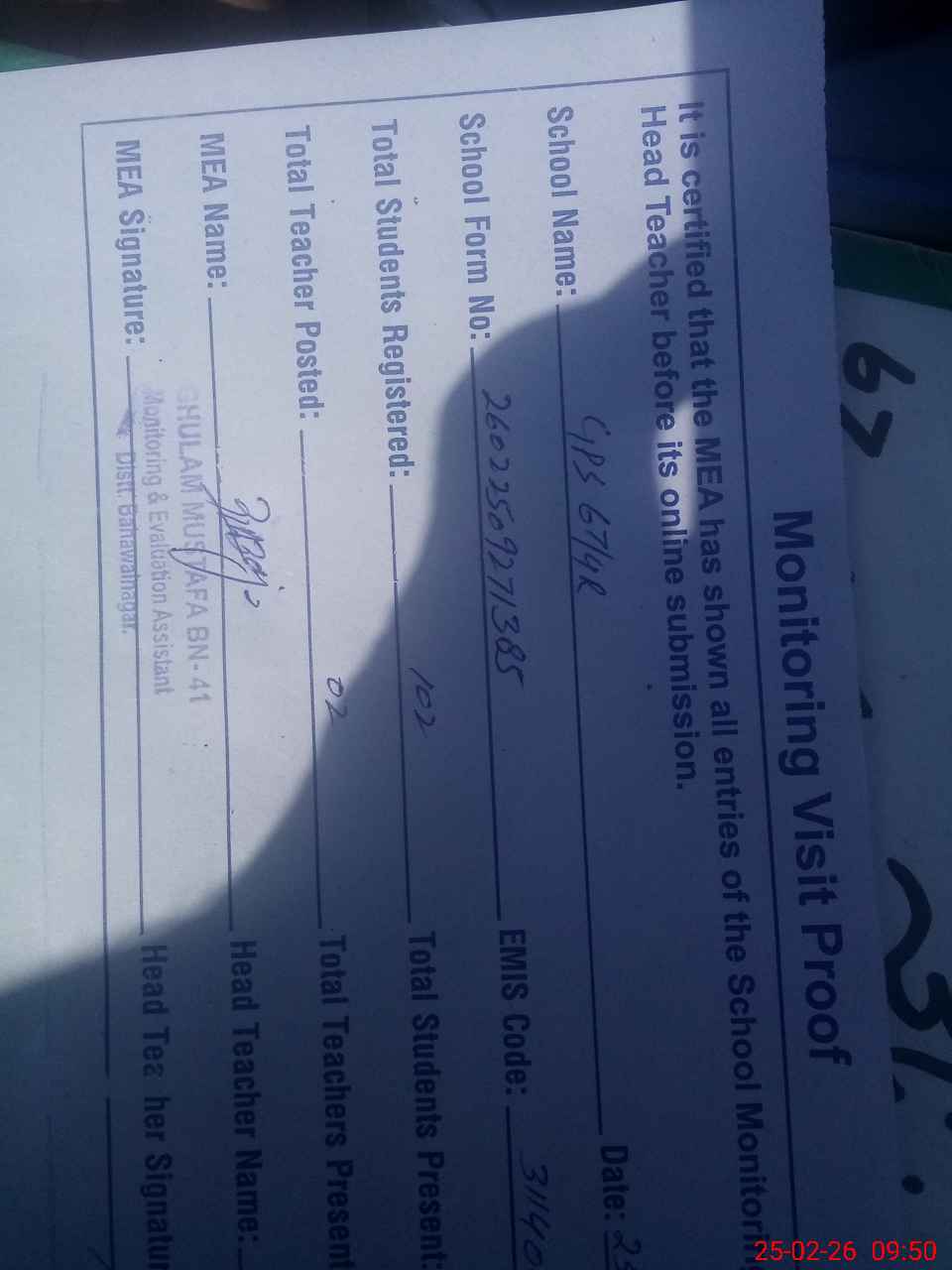 | Attendance Register | Head Teacher | MEA with School | Visit Proof |