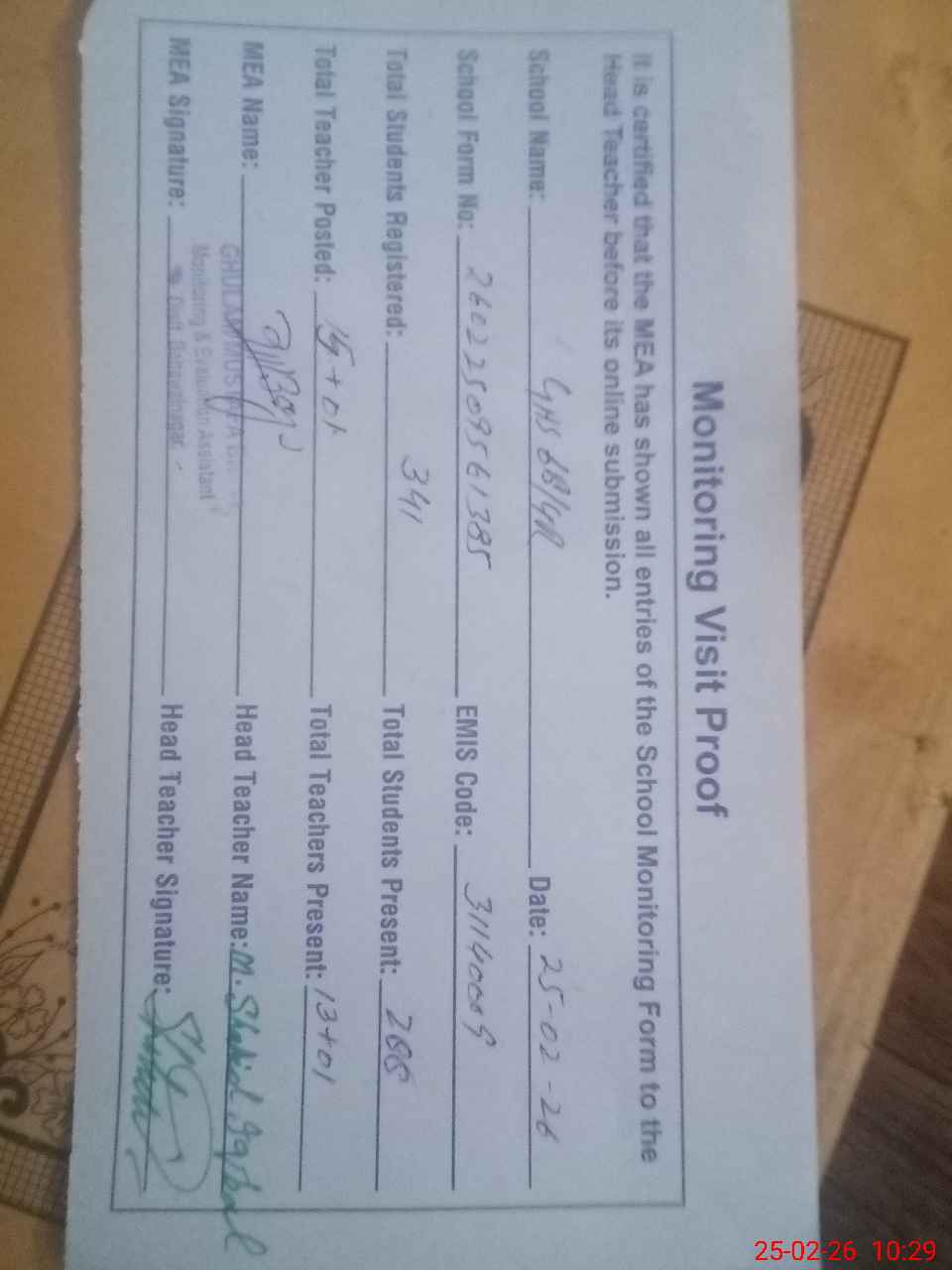 | Attendance Register | Head Teacher | MEA with School | Visit Proof |