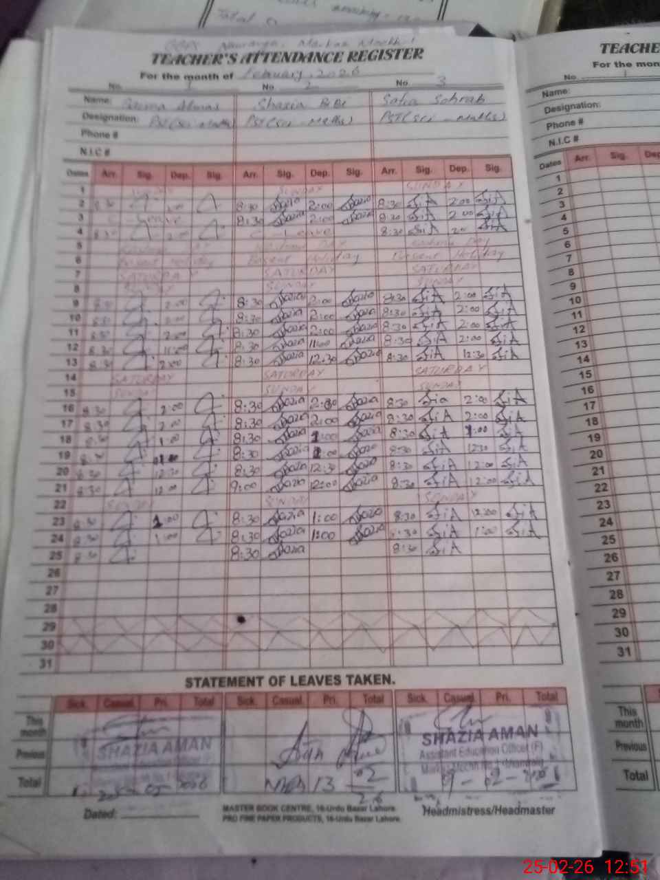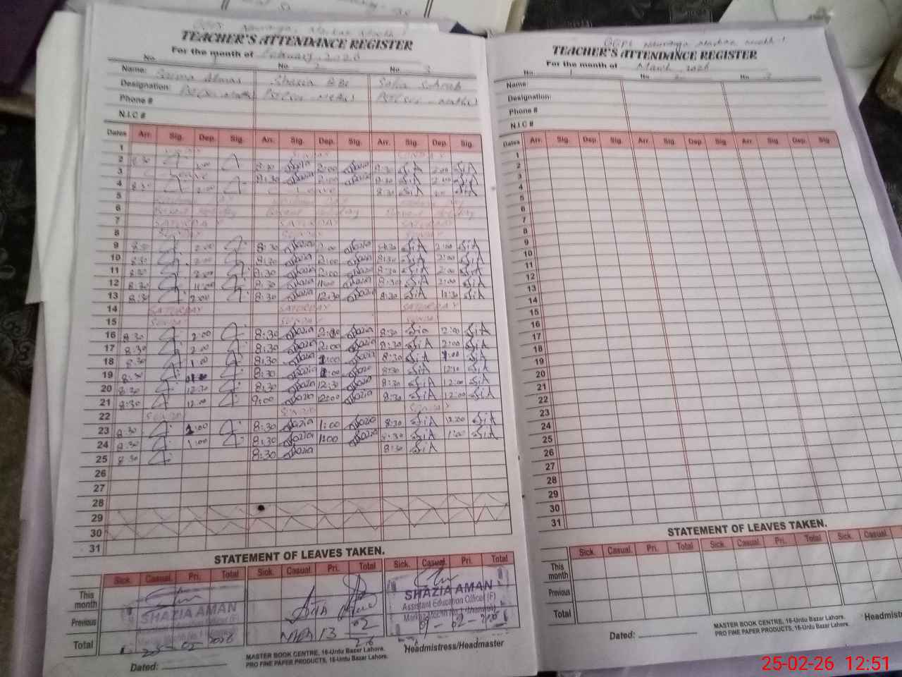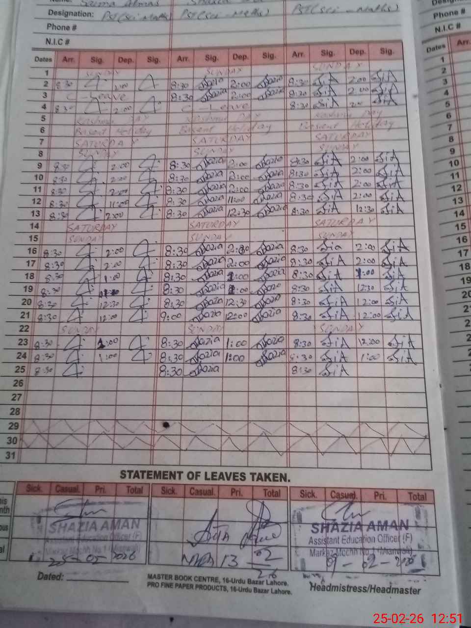 | CNIC | Full Name | Designation | R/C | Absence During Last Calender Month |
