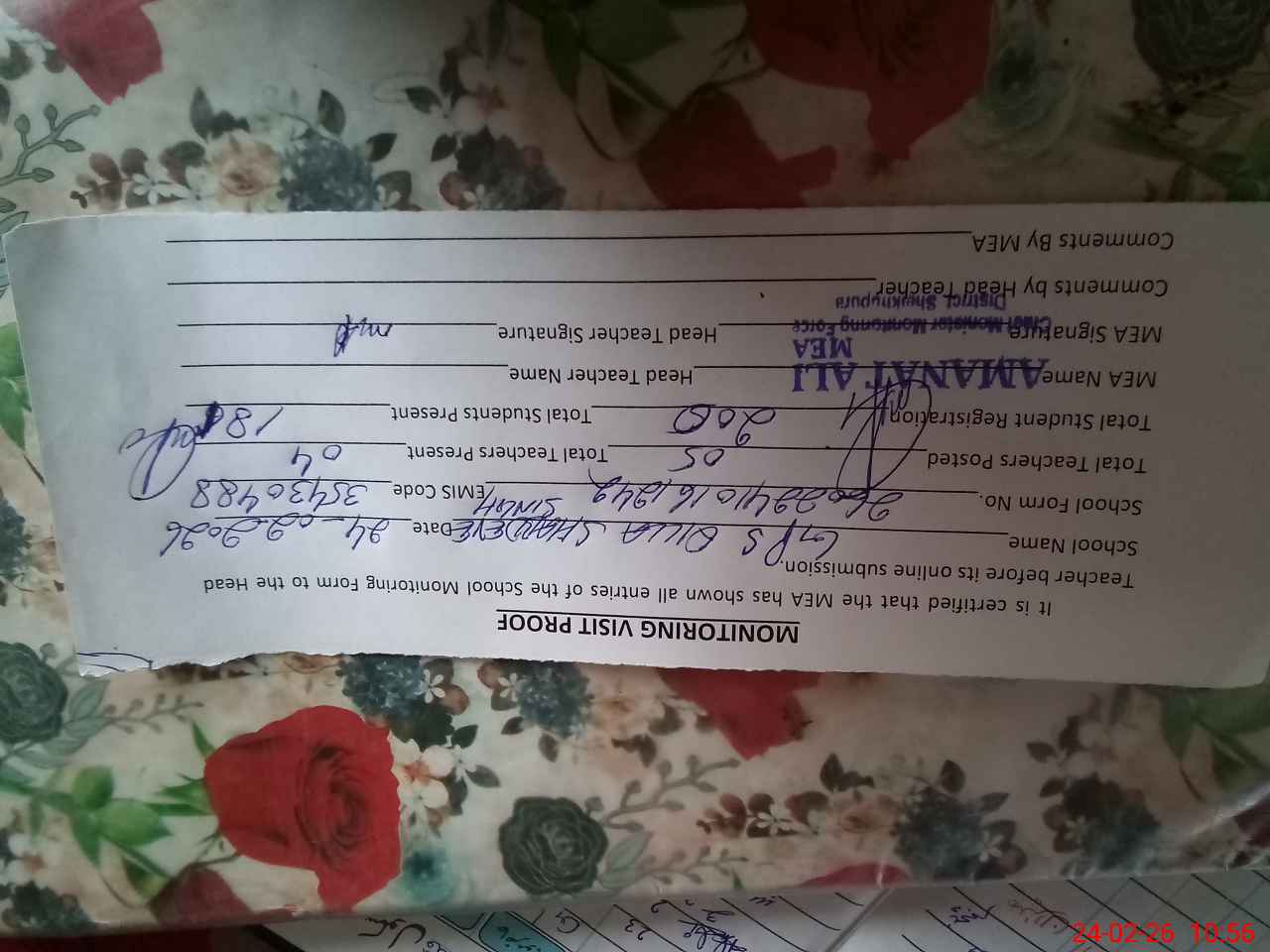 | Certified that this School was Inspected by the Undersigned MEA/DMO Today and the Information Stated Above is as Per Record. | |||||