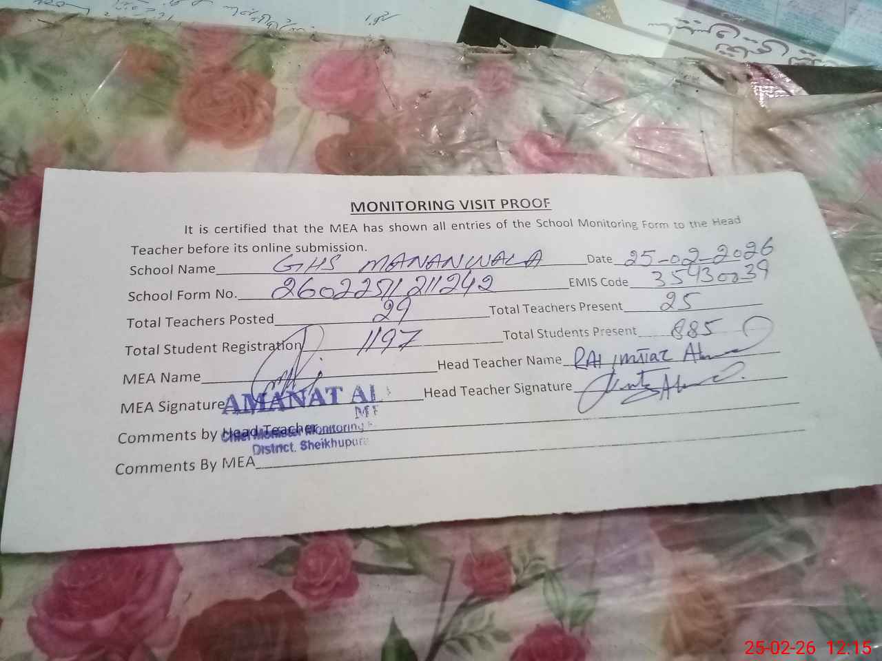 | Monitoring Date: 25-02-2026 | Start Time: 25-02-2026 10:49 AM | End Time: 25-02-2026 12:56 PM | Name of MEA: Am**** Al**** | |