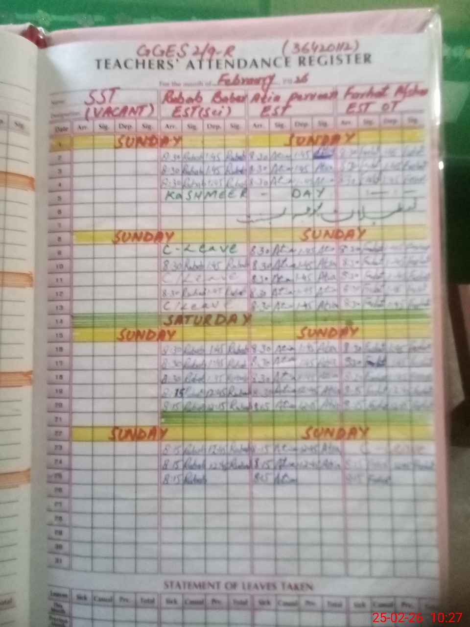 | Leave | Duty | Absent | Maternity | Medical | Ex- Pak |