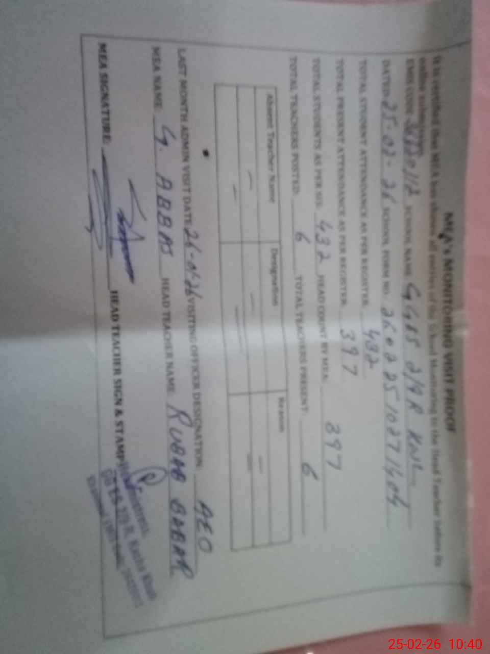 | Attendance Register | Head Teacher | MEA with School | Visit Proof |